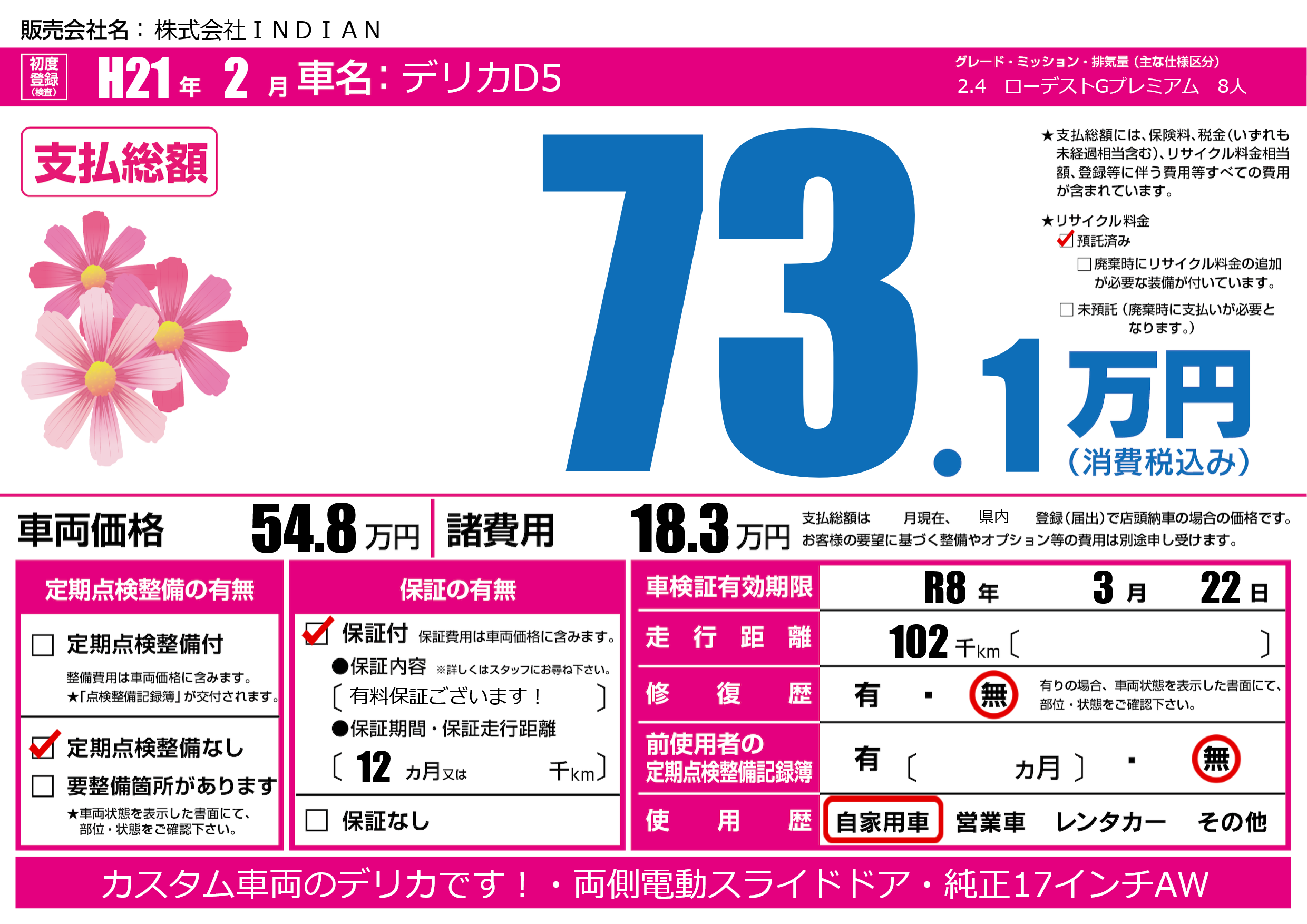 | 車名 | デリカD5 | グレード ミッション 排気量 |