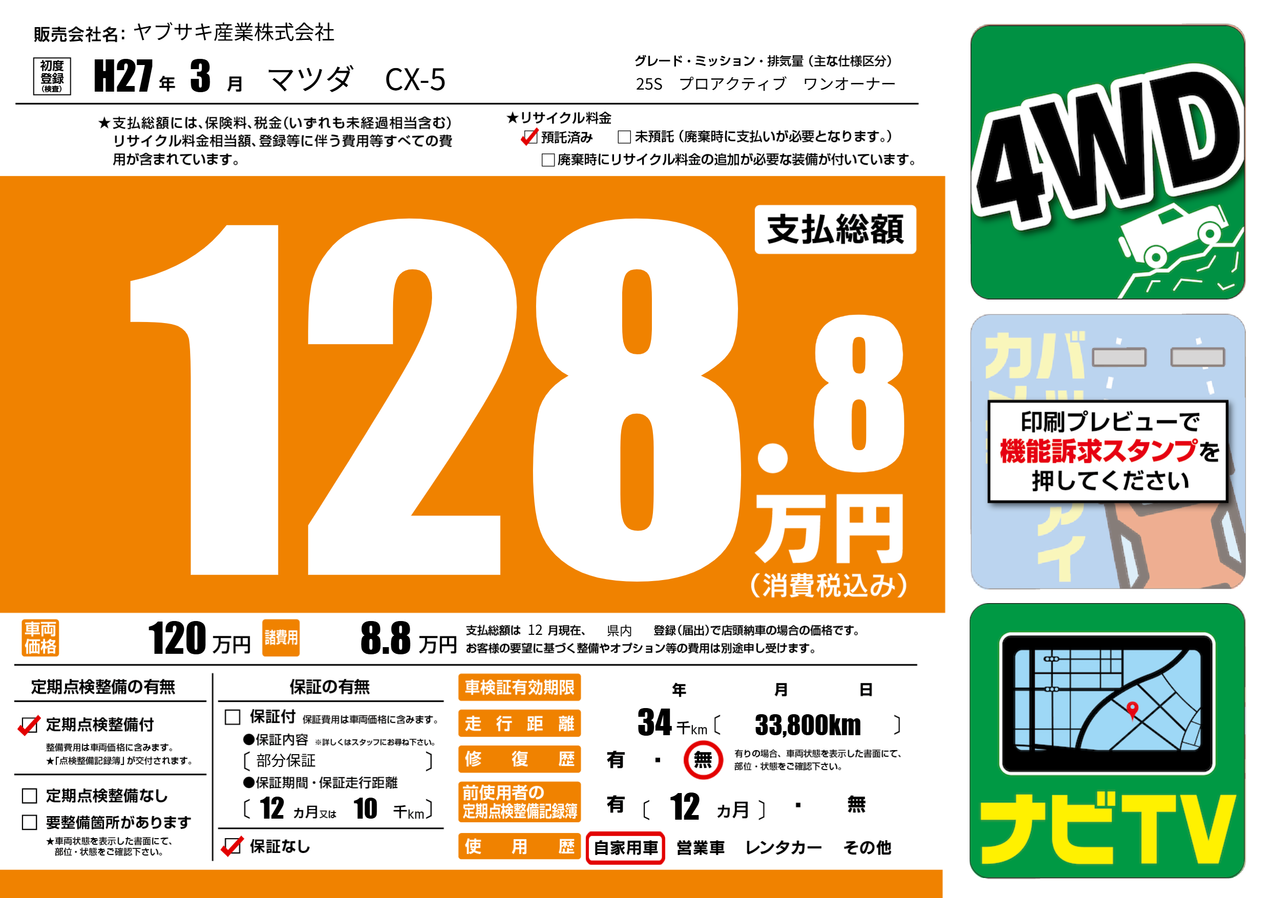 | 車名 | マツダ CX-5 | グレード ミッション 排気量 |