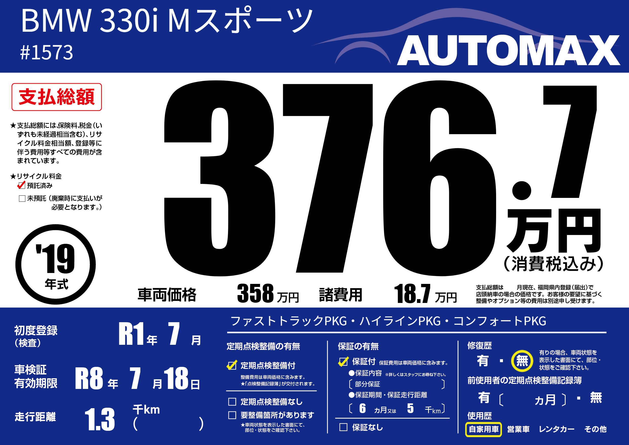| 車名 | BMW 330i Mスポーツ | グレード ミッション 排気量 |