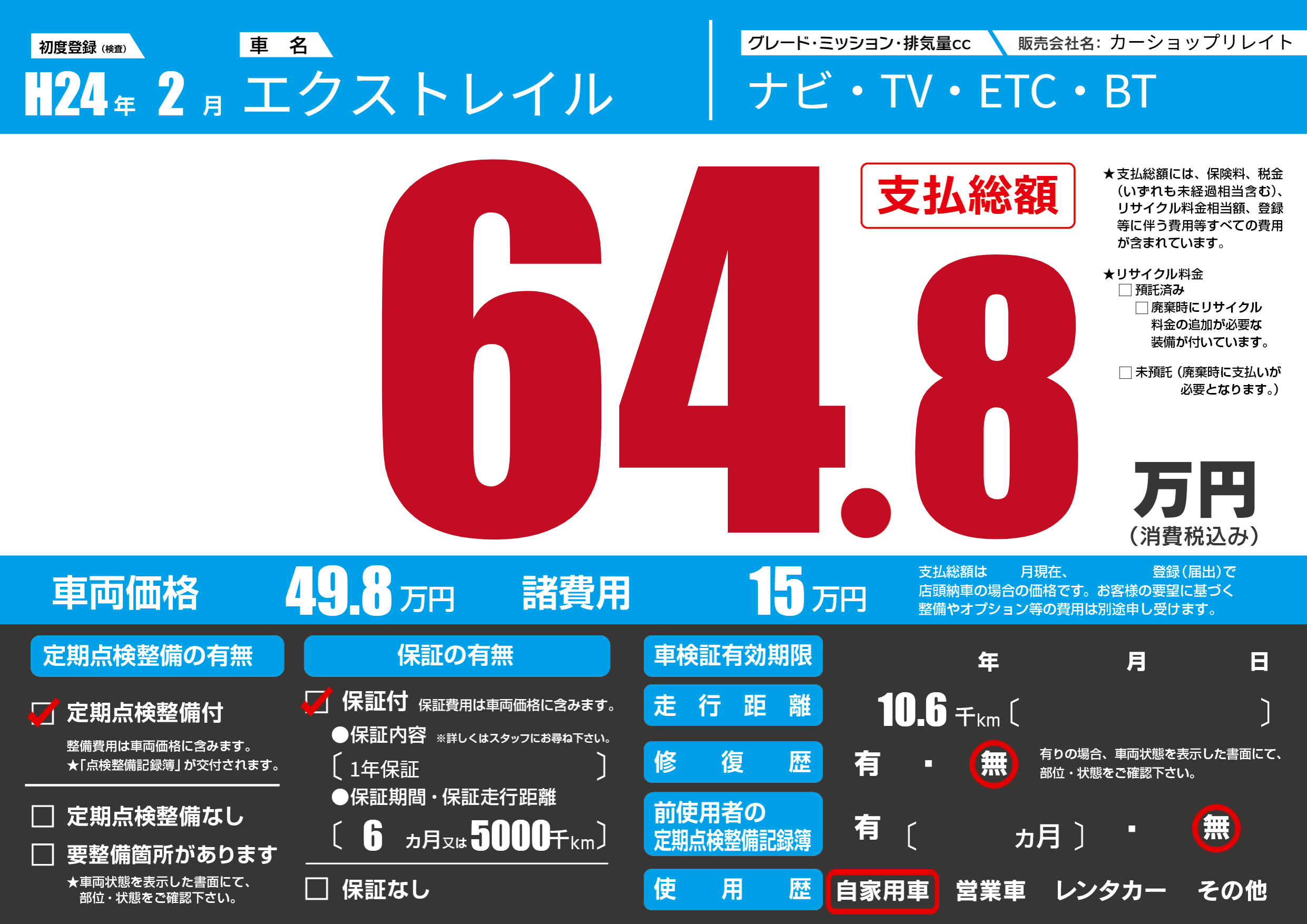 | 走行キロ | 1万km | 初年度登録 | H24年2月 |