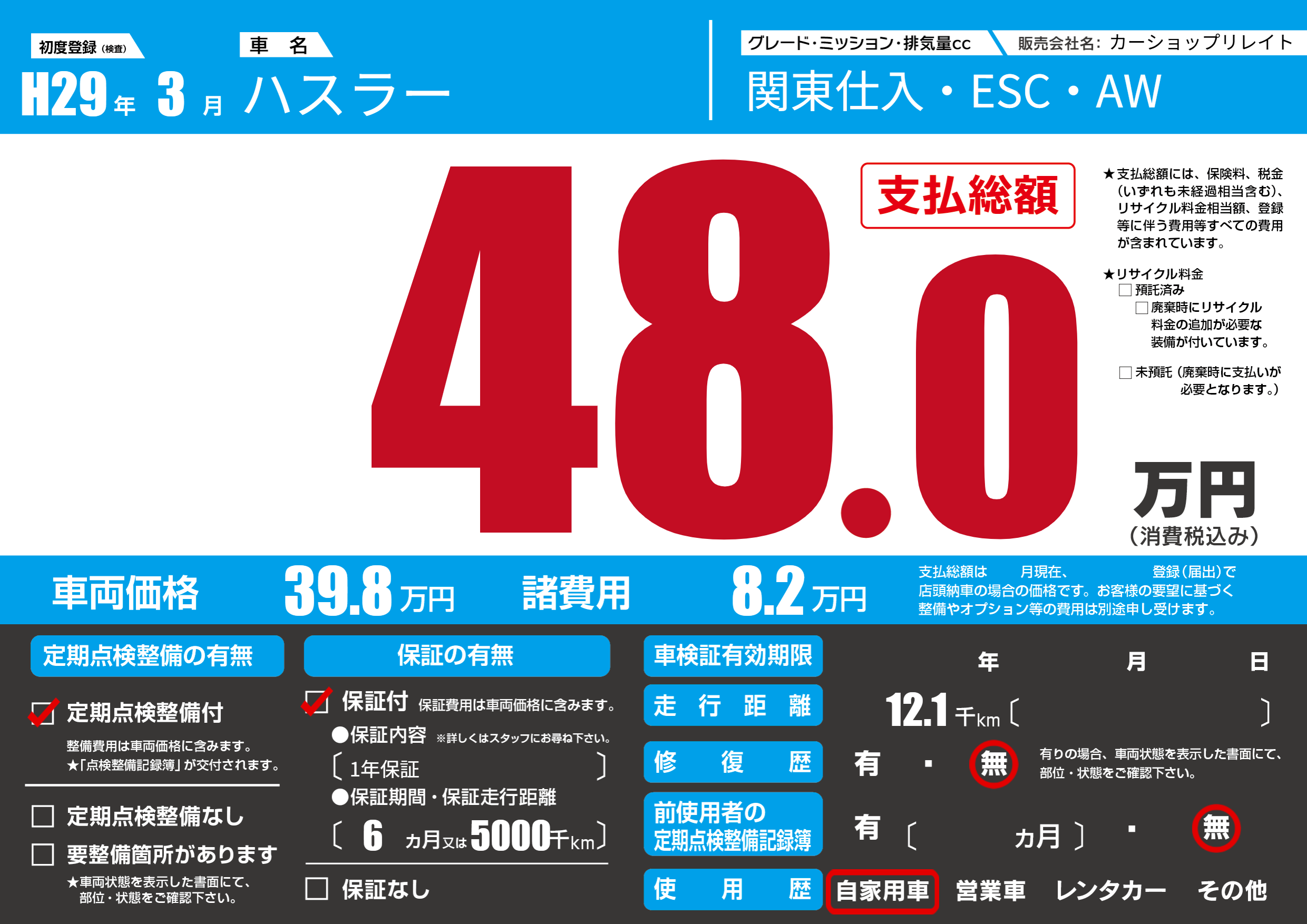 | 車名 | ハスラー | グレード ミッション 排気量 |
