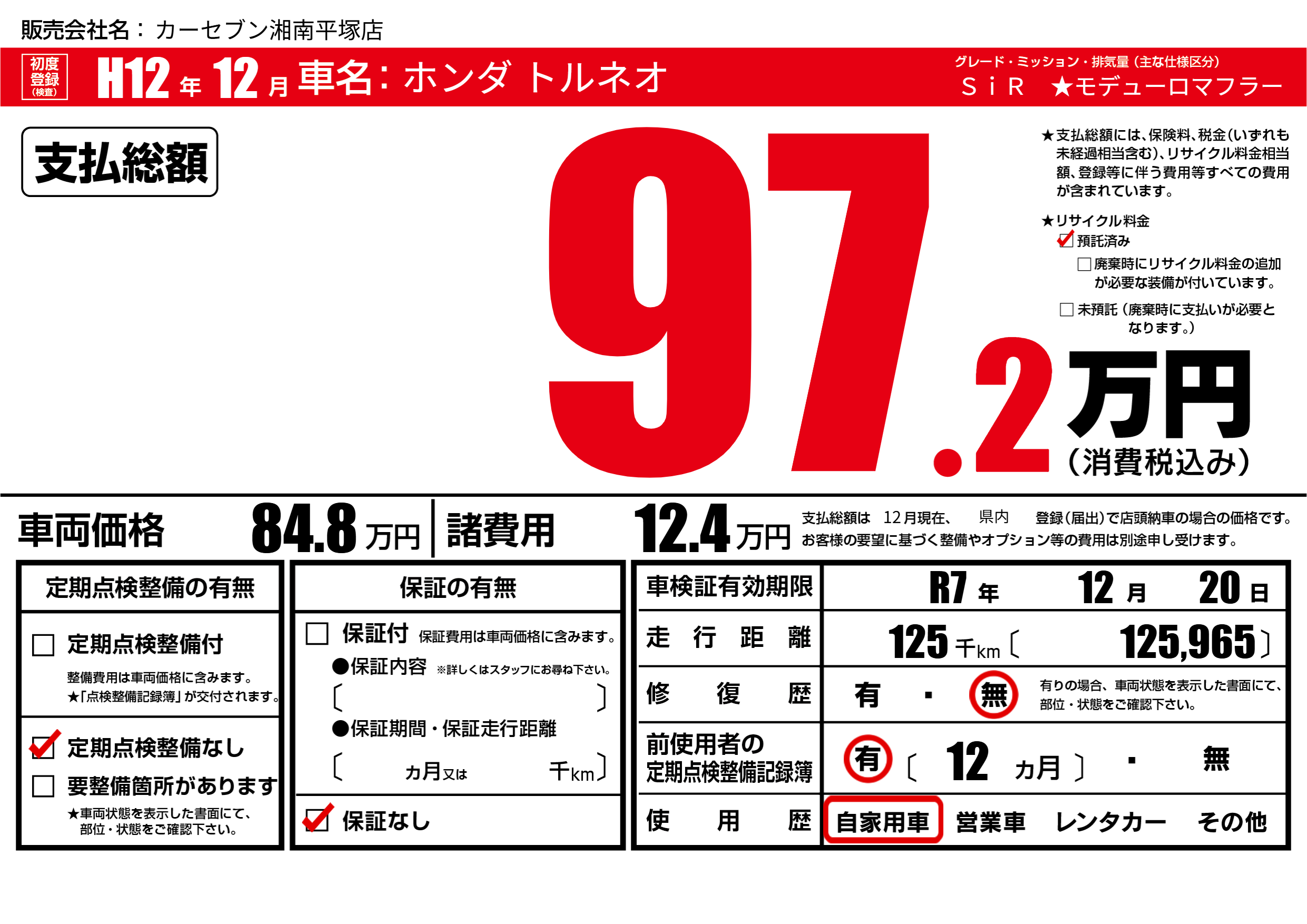なし | 車検制限 | R7年12月20月 |
