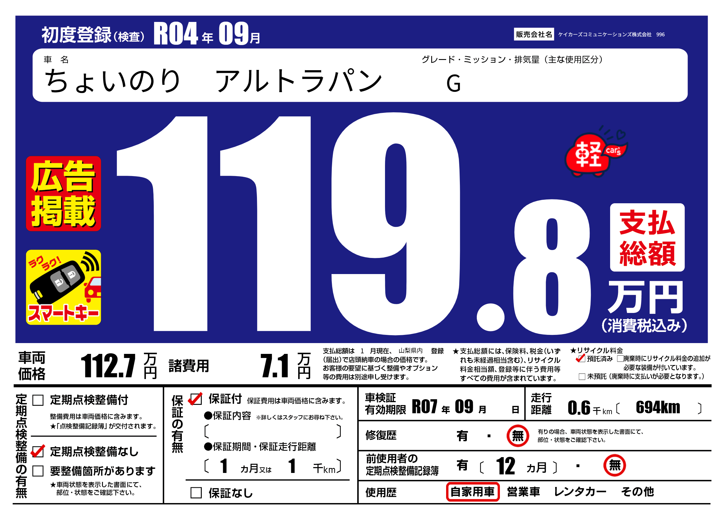 | 走行キロ | - | 初年度登録 | R04年09月 |