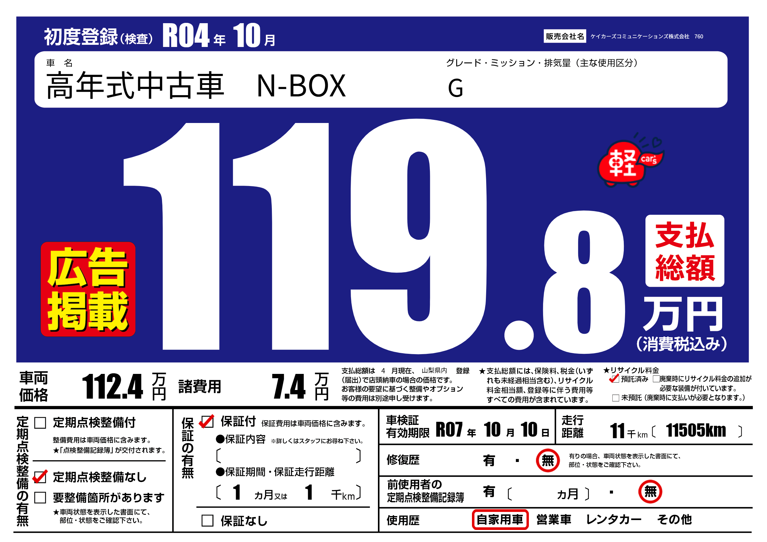 | 走行キロ | 1.1万km | 初年度登録 | R04年10月 |