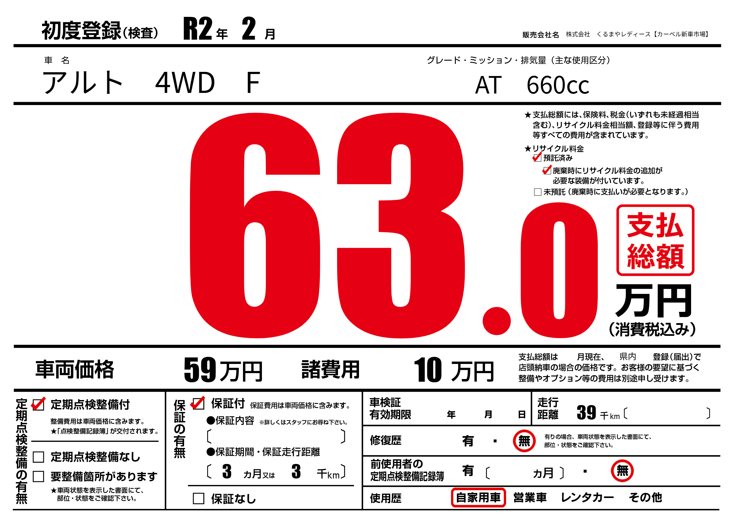 | 車名 | アルト 4WD F | グレード ミッション 排気量 |