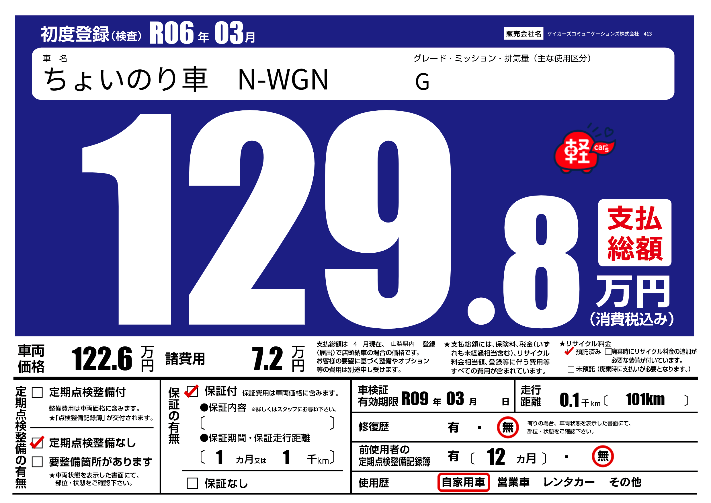 | 車名 | ちょいのり車 N-WGN | グレード ミッション 排気量 |