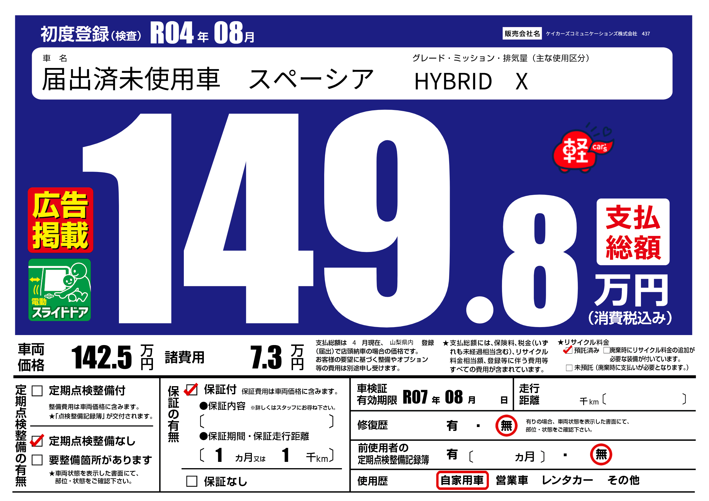 | 車検制限 | R07年 08月 - 日 | ||