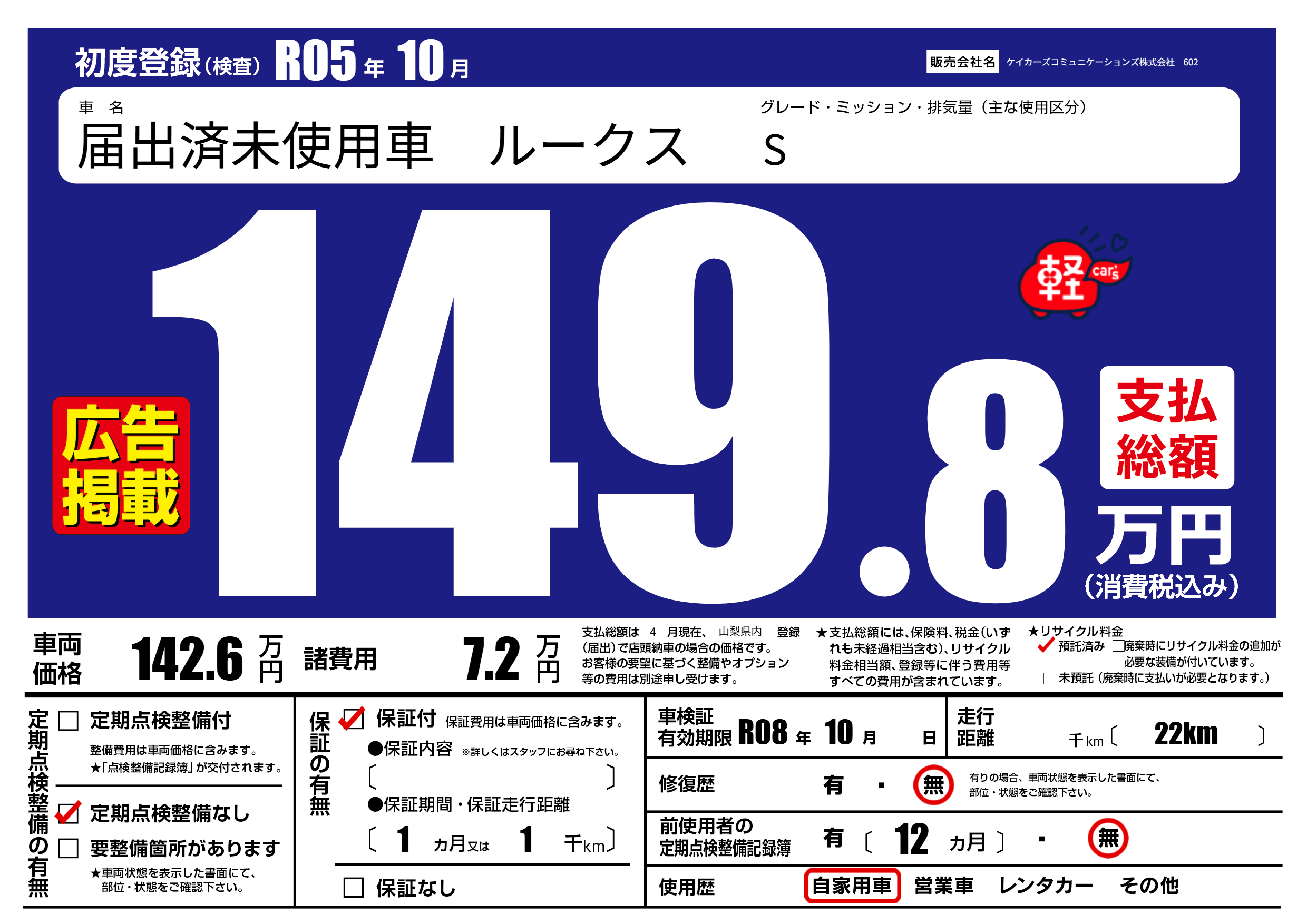 | 走行キロ | - | 初年度登録 | R05年10月 |