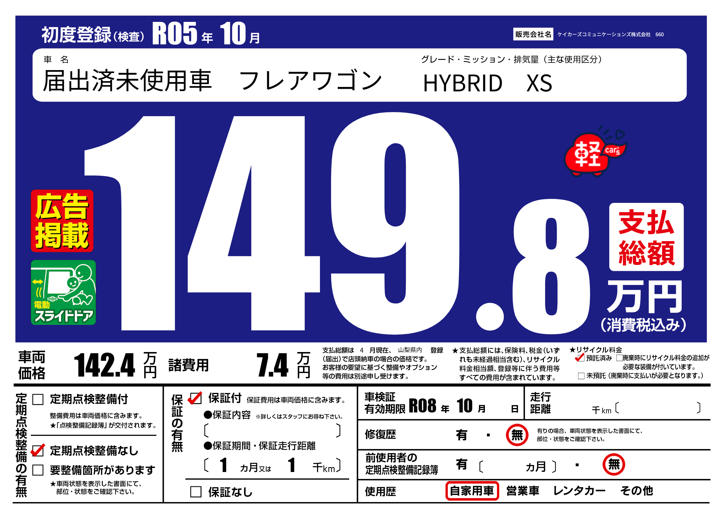 | 車名 | 届出済未使用車 フレアワゴン | グレード ミッション 排気量 |