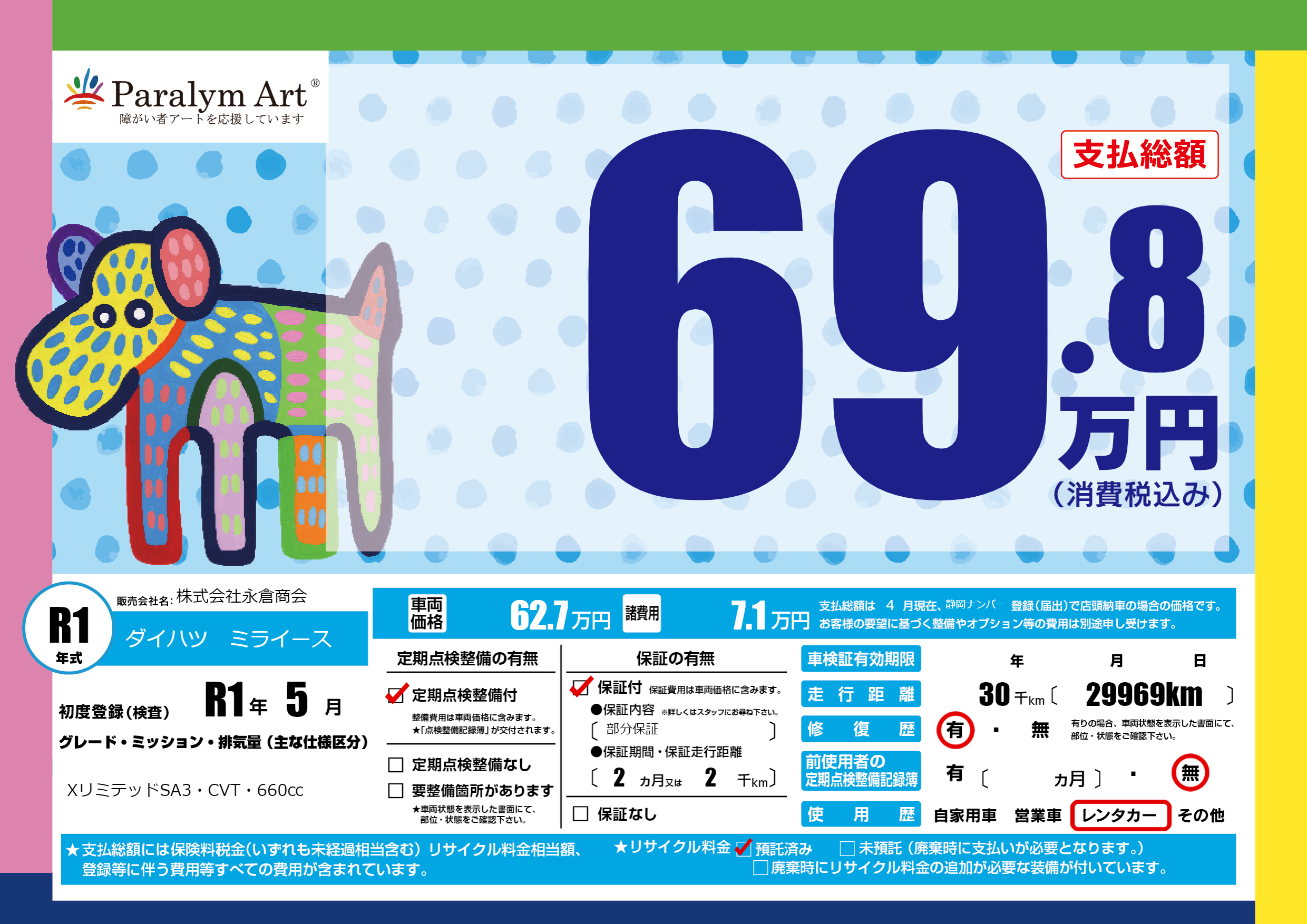 | 走行キロ | 3万km | 初年度登録 | R1年5月 |