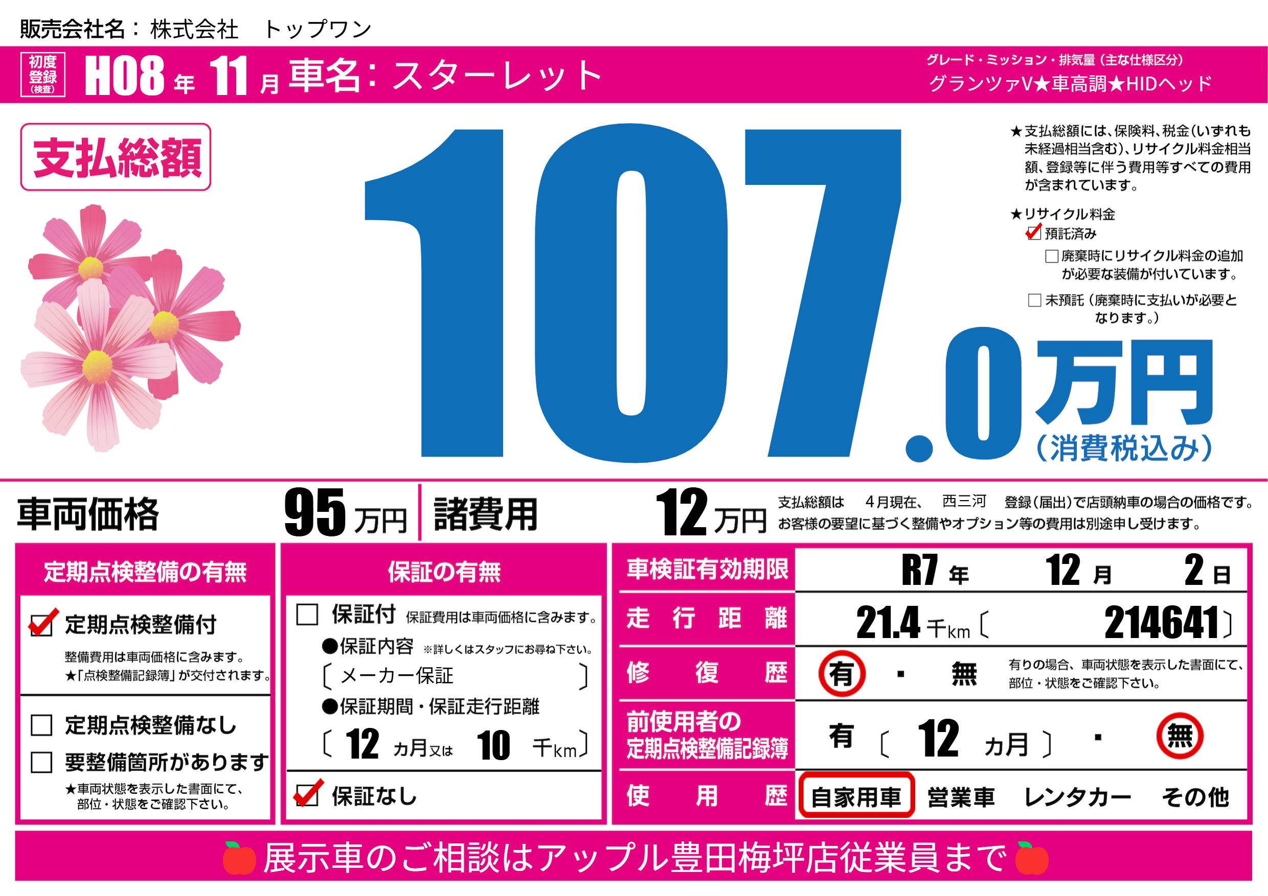 | 車名 | スターレット | グレード ミッション 排気量 |