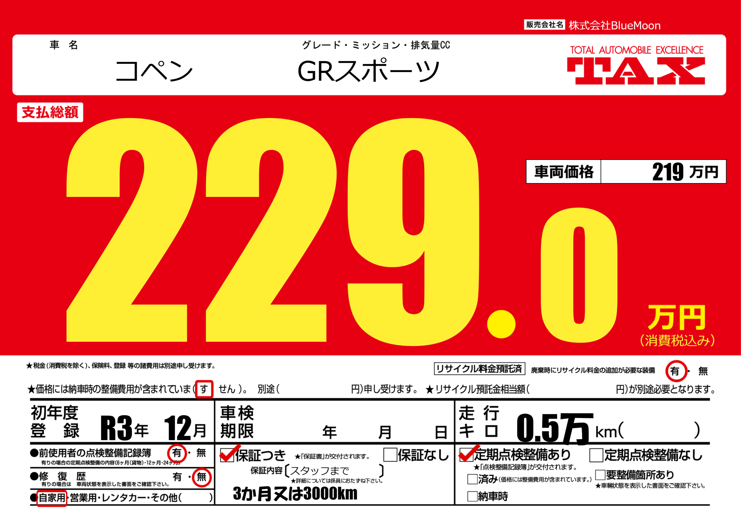 保証付き 保証内容(スタッフまで) ---ヶ月または()千kmまで |