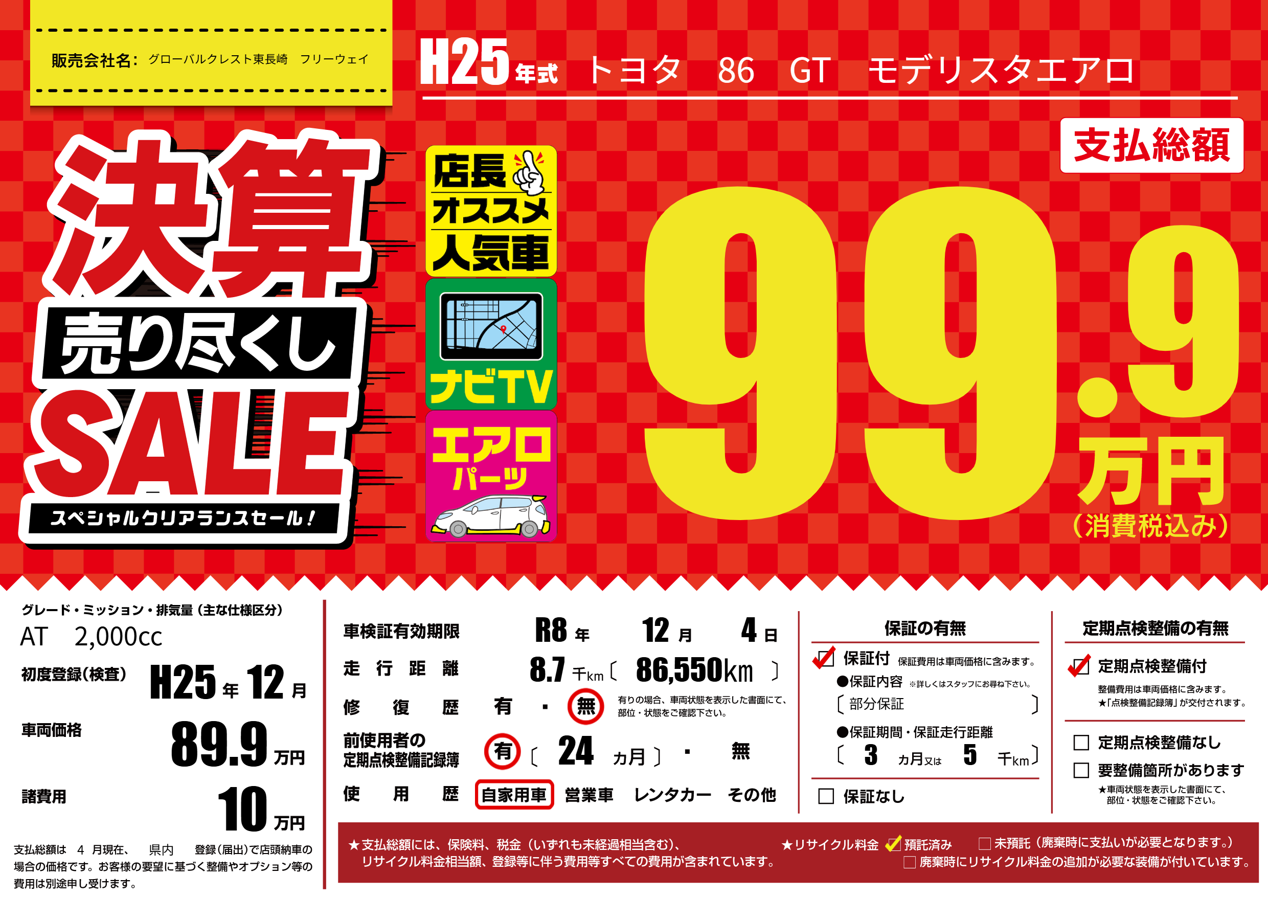 | 車名 | トヨタ 86 GT モデリスタエアロ | グレード ミッション 排気量 |