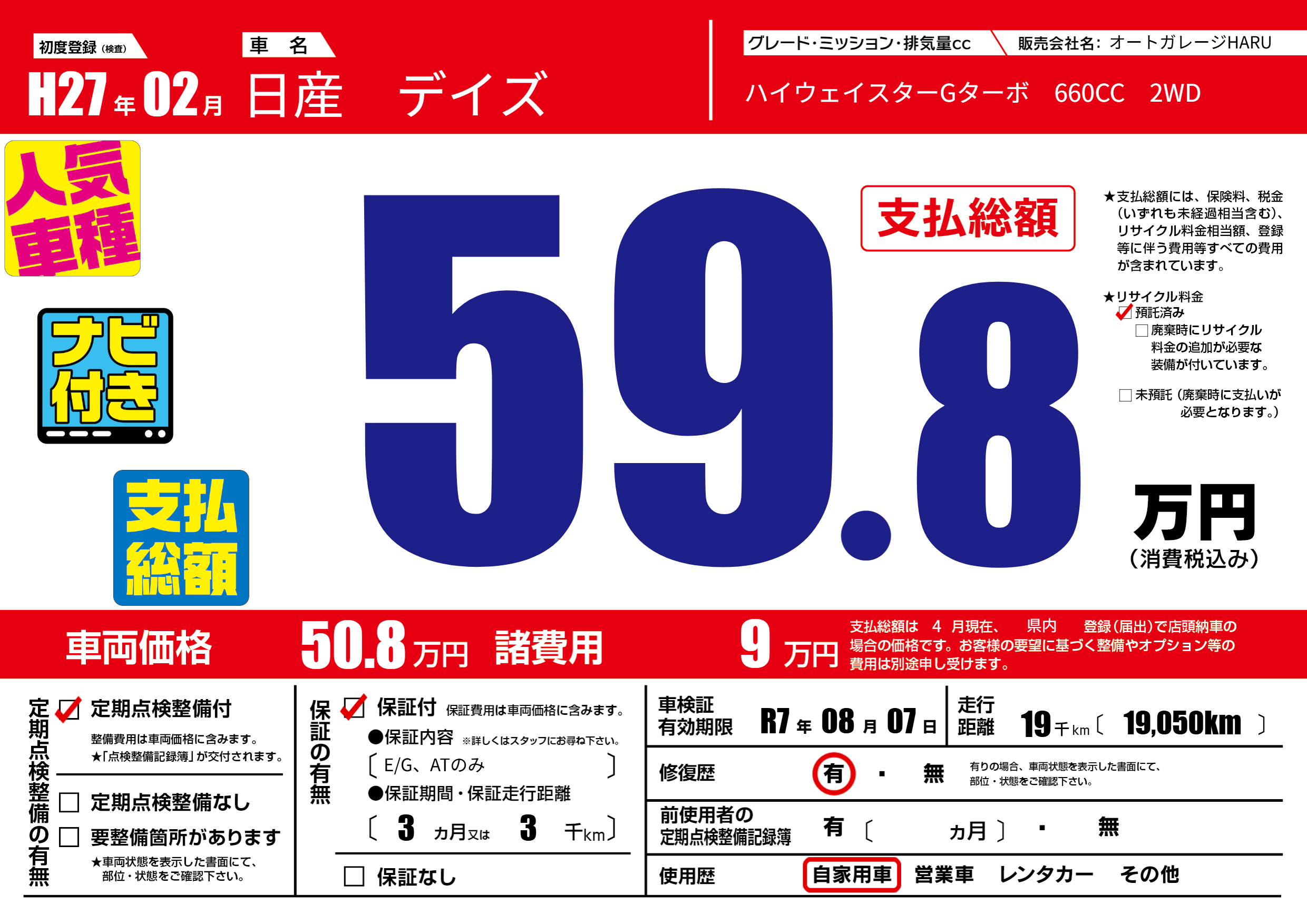| 車名 | 日産 デイズ | グレード ミッション 排気量 |