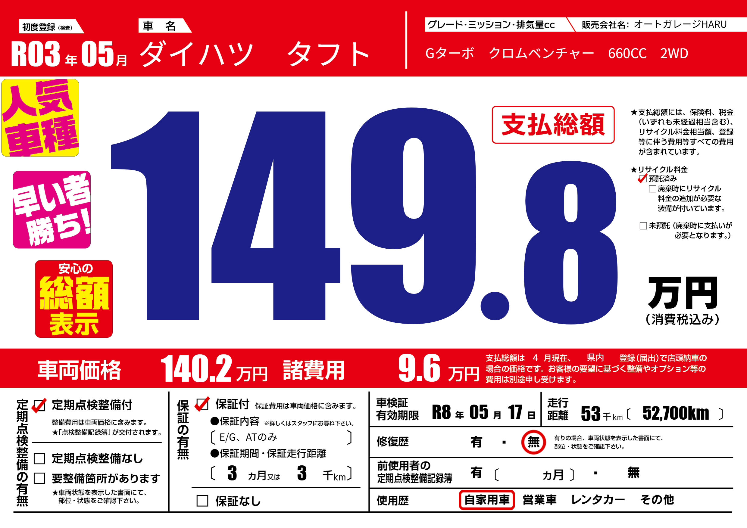 | 車名 | ダイハツ タフト | グレード ミッション 排気量 |