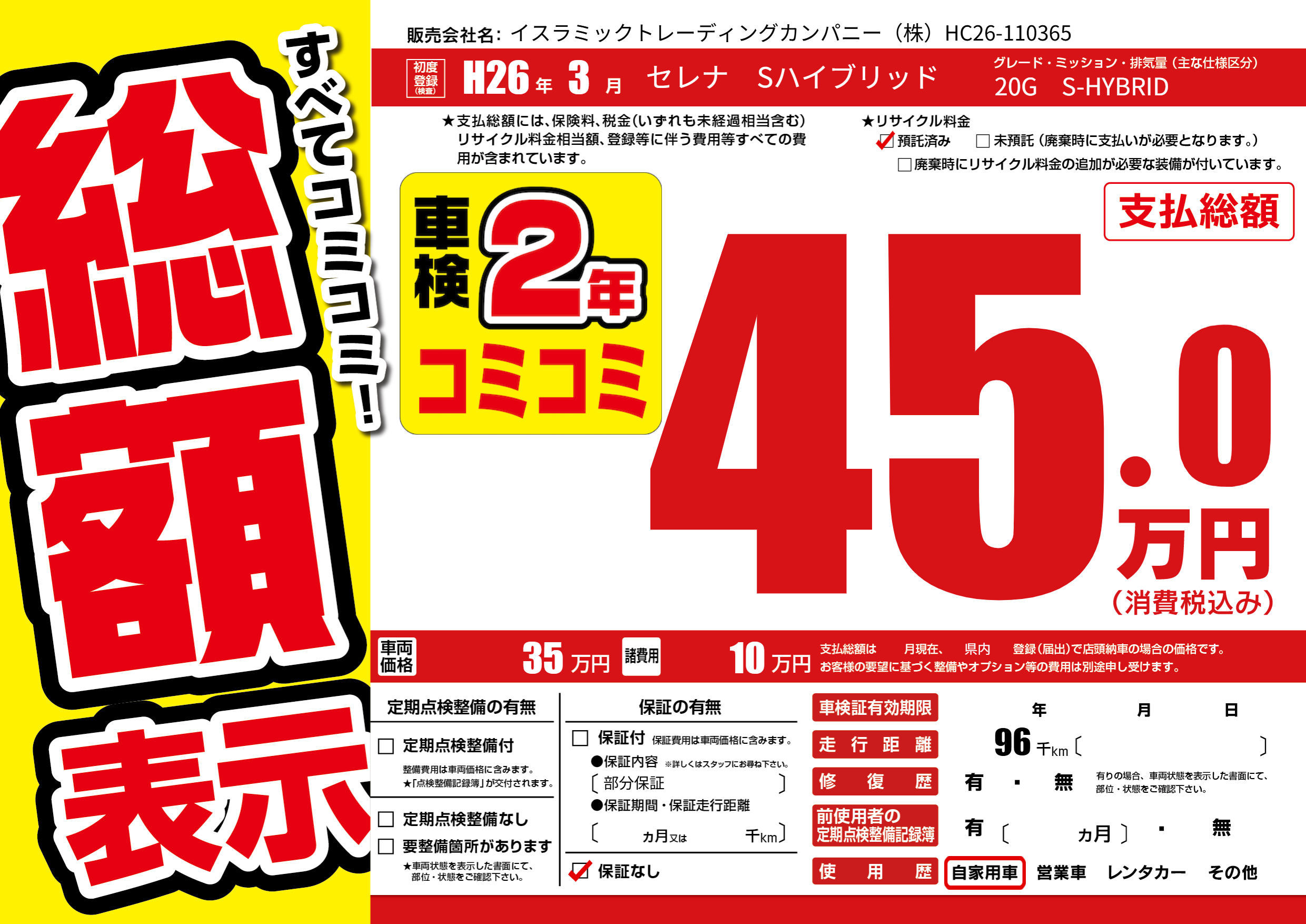 | 走行キロ | 9.6万km | 初年度登録 | H26年3月 |