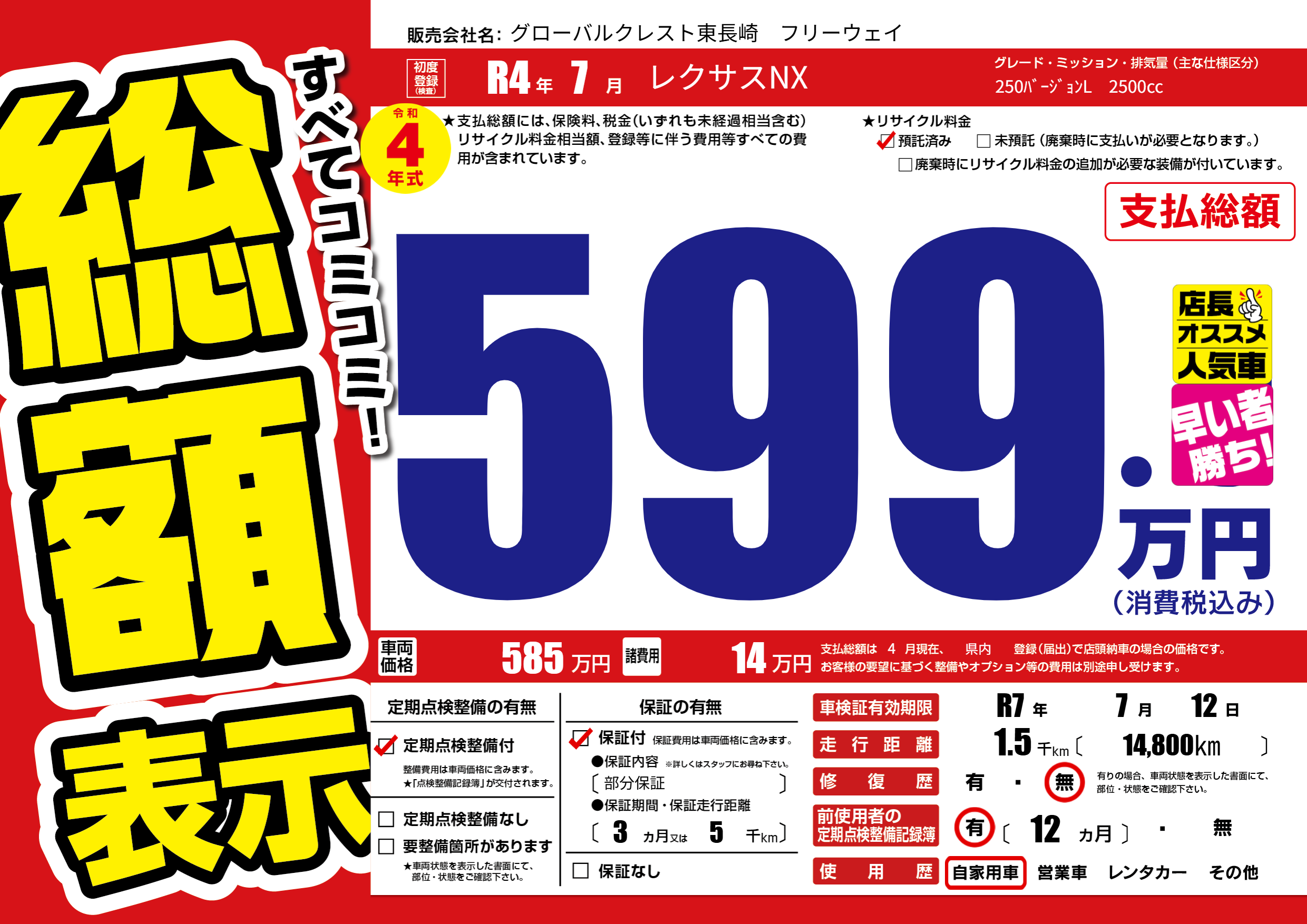 | 車名 | レクサスNX | グレード ミッション 排気量 |