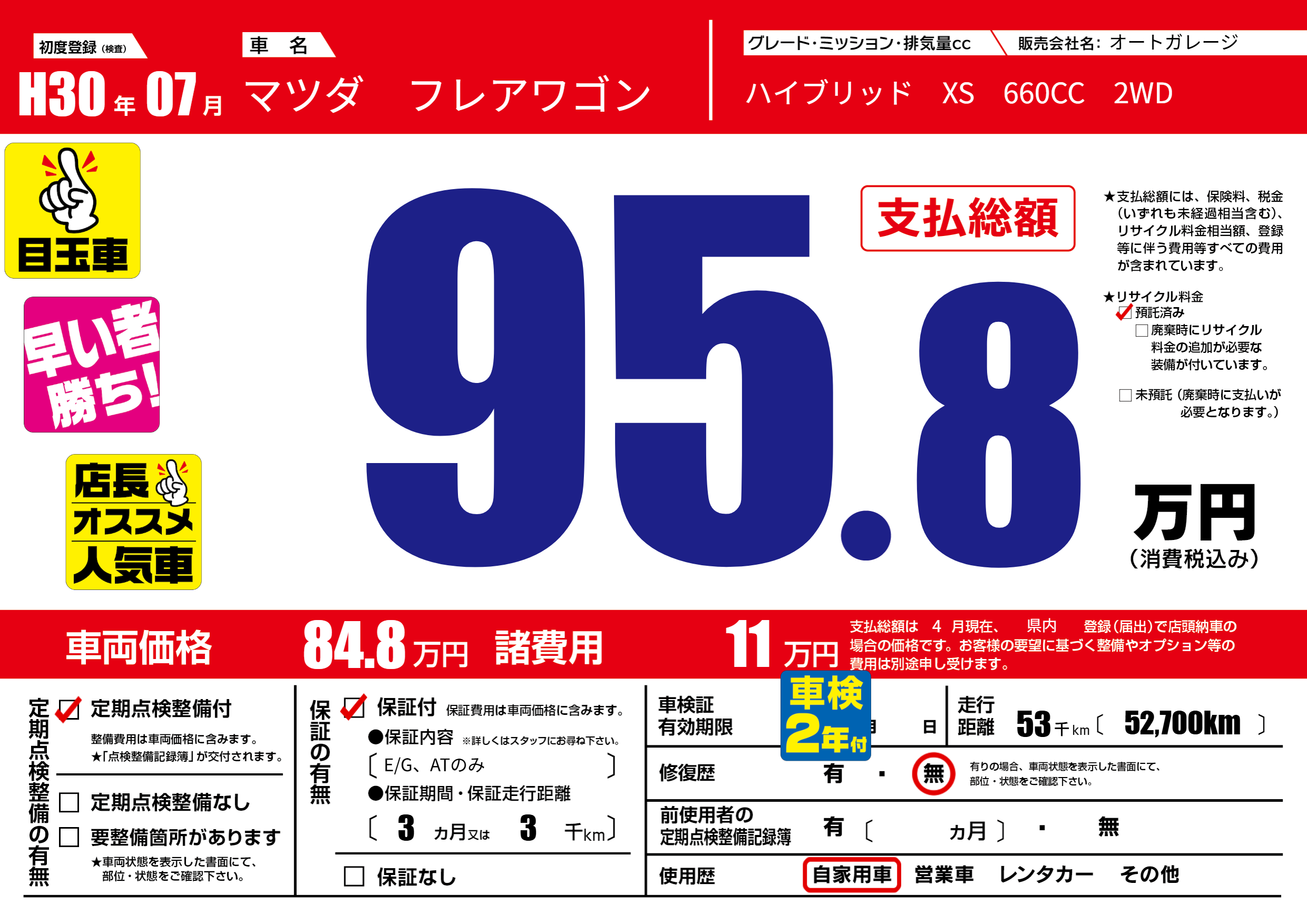 | 車名 | マツダ フレアワゴン | グレード ミッション 排気量 |