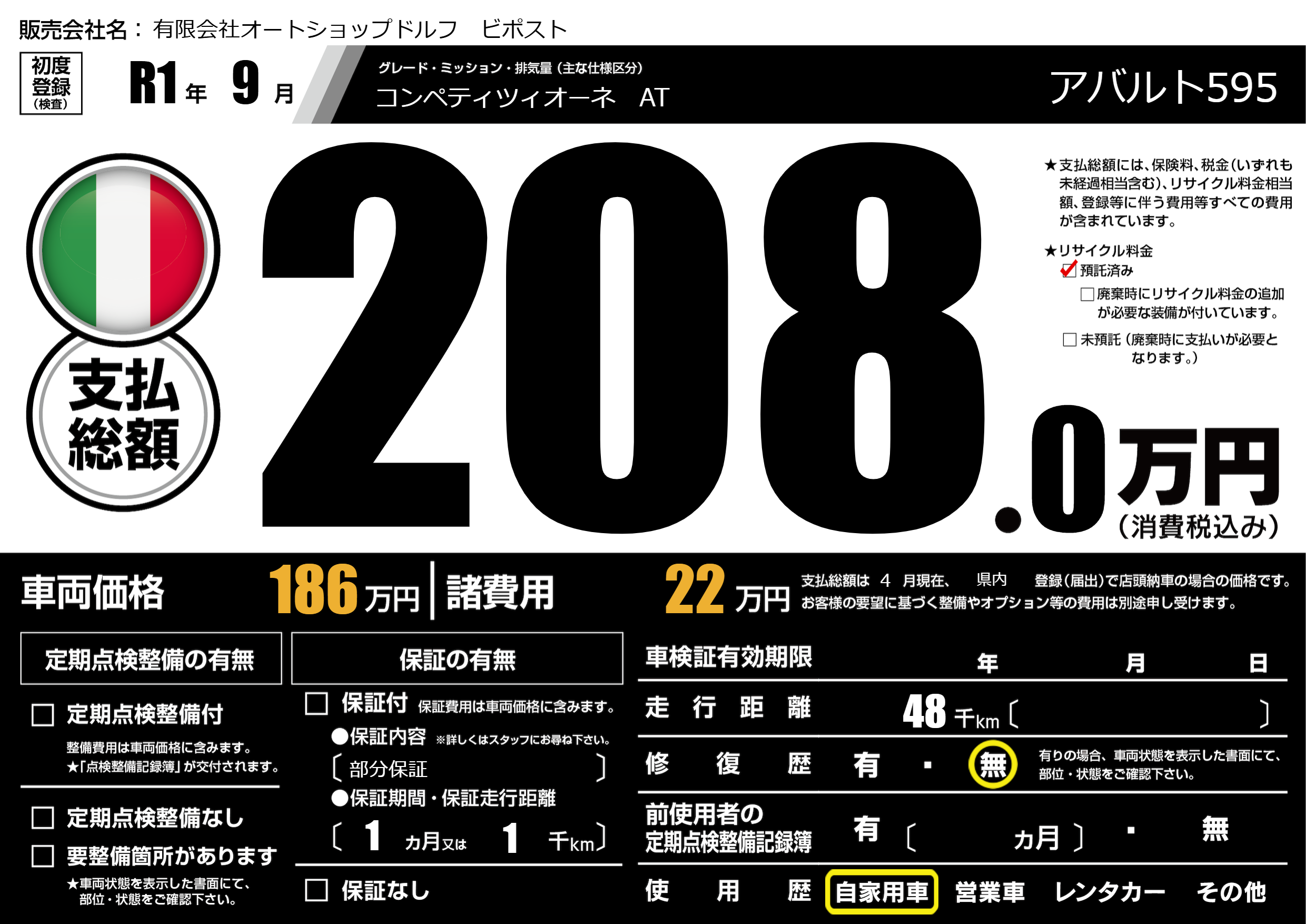 | 車名 | アバルト595 | グレード ミッション 排気量 |