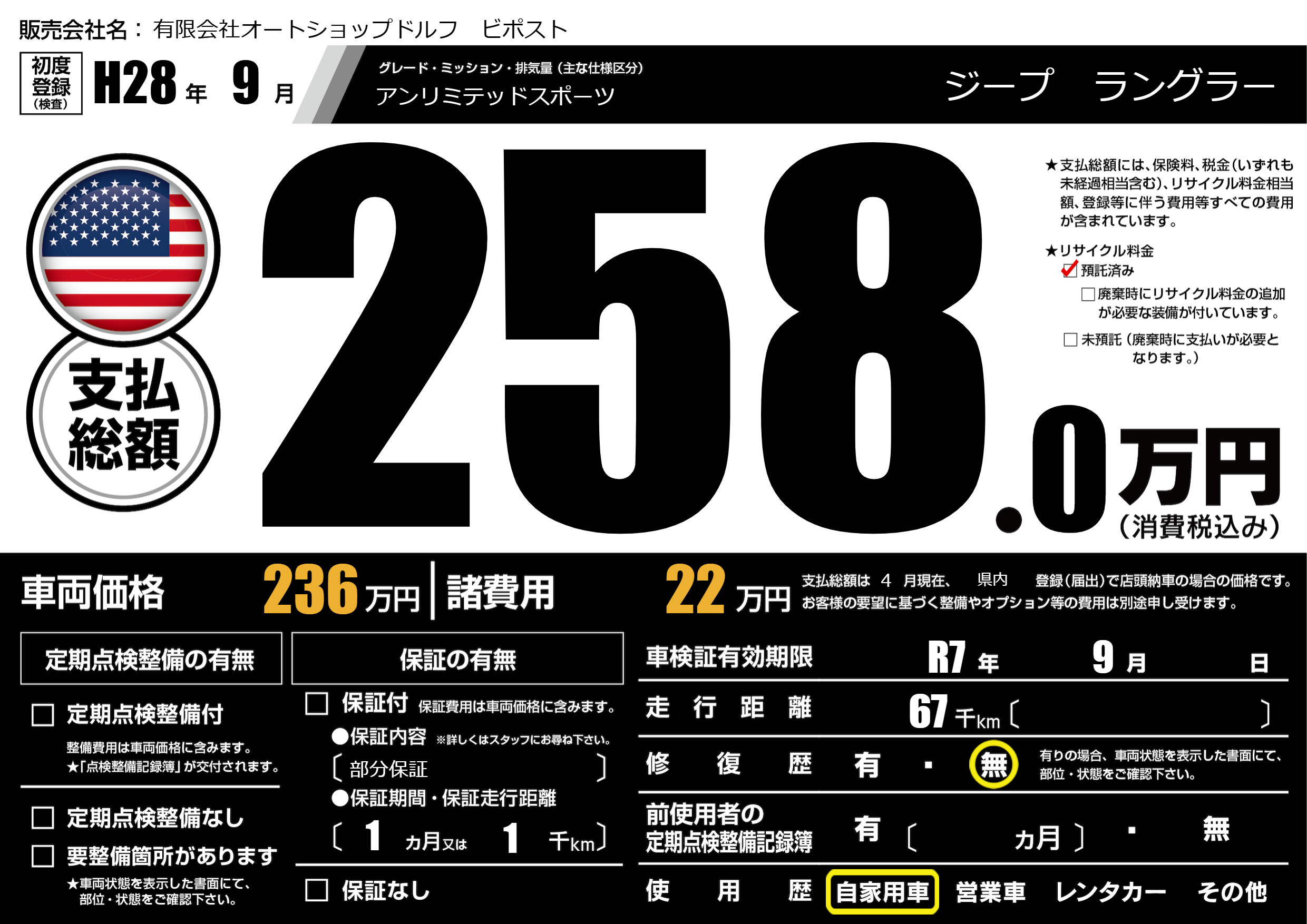 | 車名 | ジープ ラングラー | グレード ミッション 排気量 |