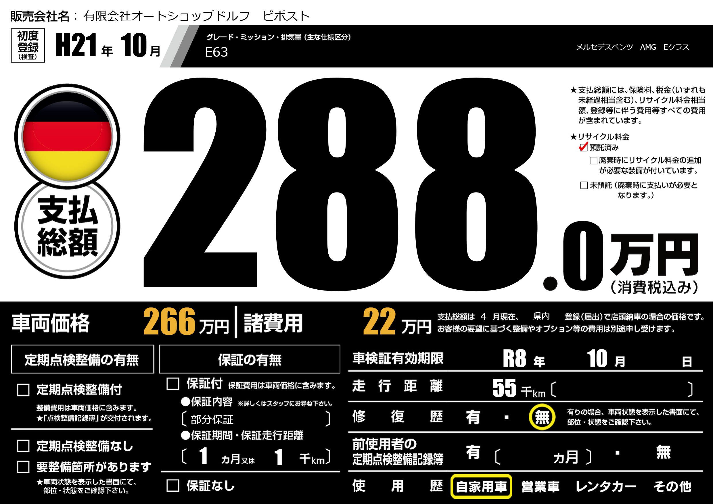 | 車名 | メルセデスベンツ AMG Eクラス | グレード ミッション 排気量 |