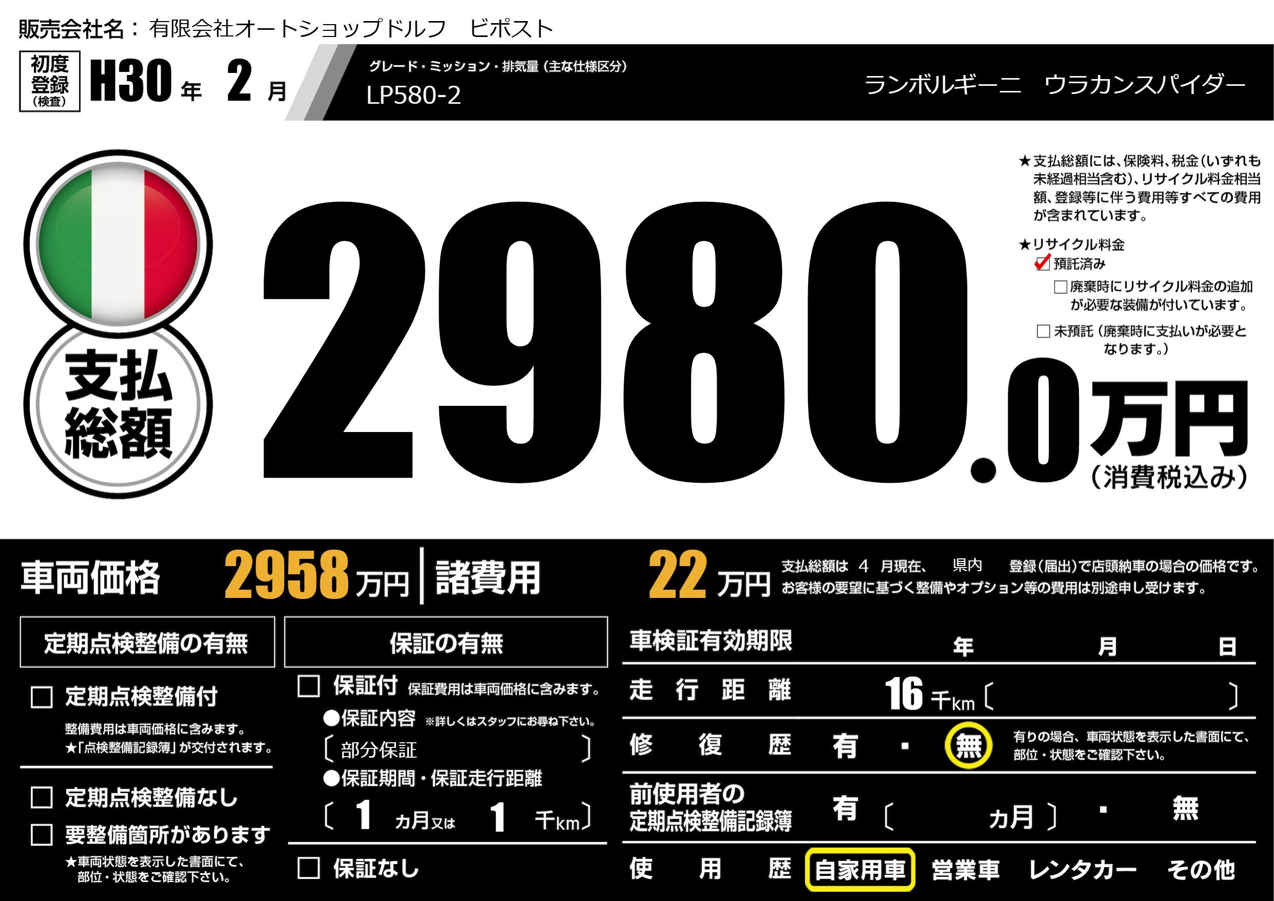 | 車名 | ランボルギーニ ウラカンスパイダー | グレード ミッション 排気量 |