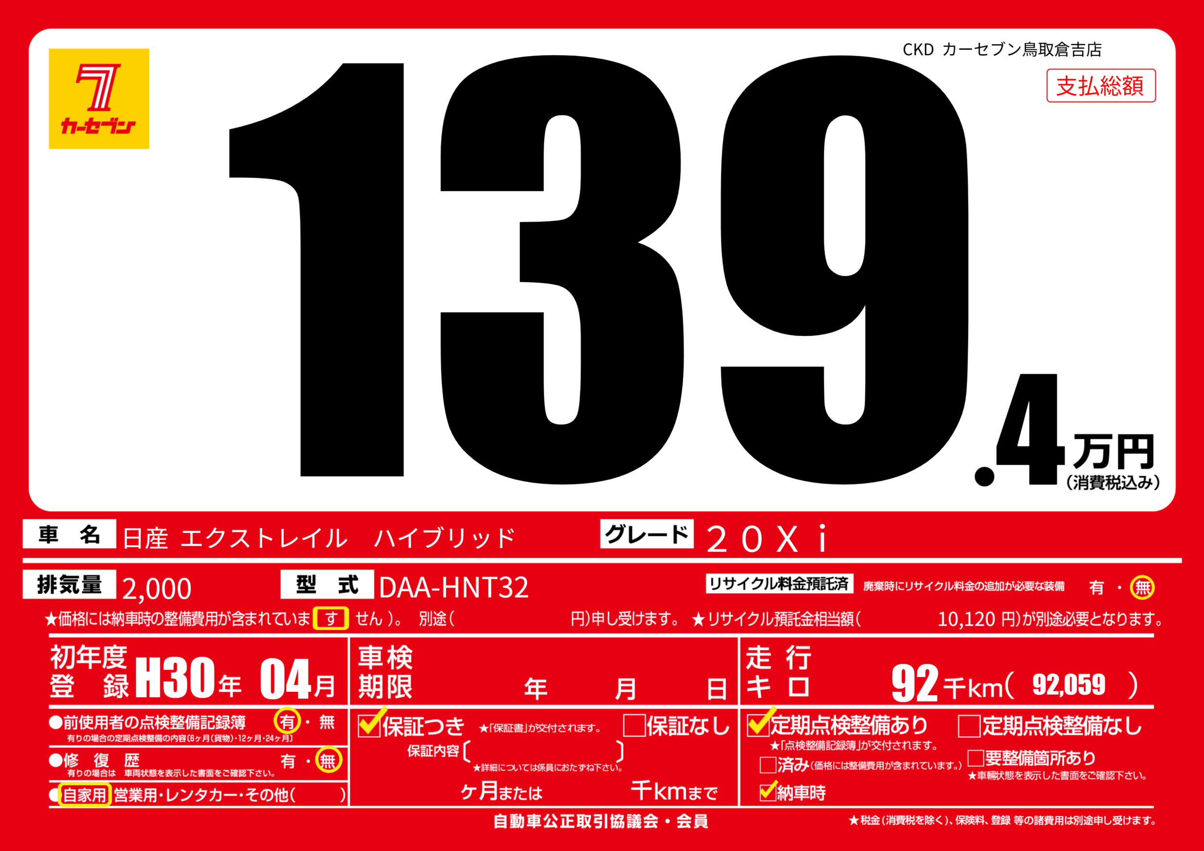 | 車名 | 日産 エクストレイル ハイブリッド | グレード ミッション 排気量 |