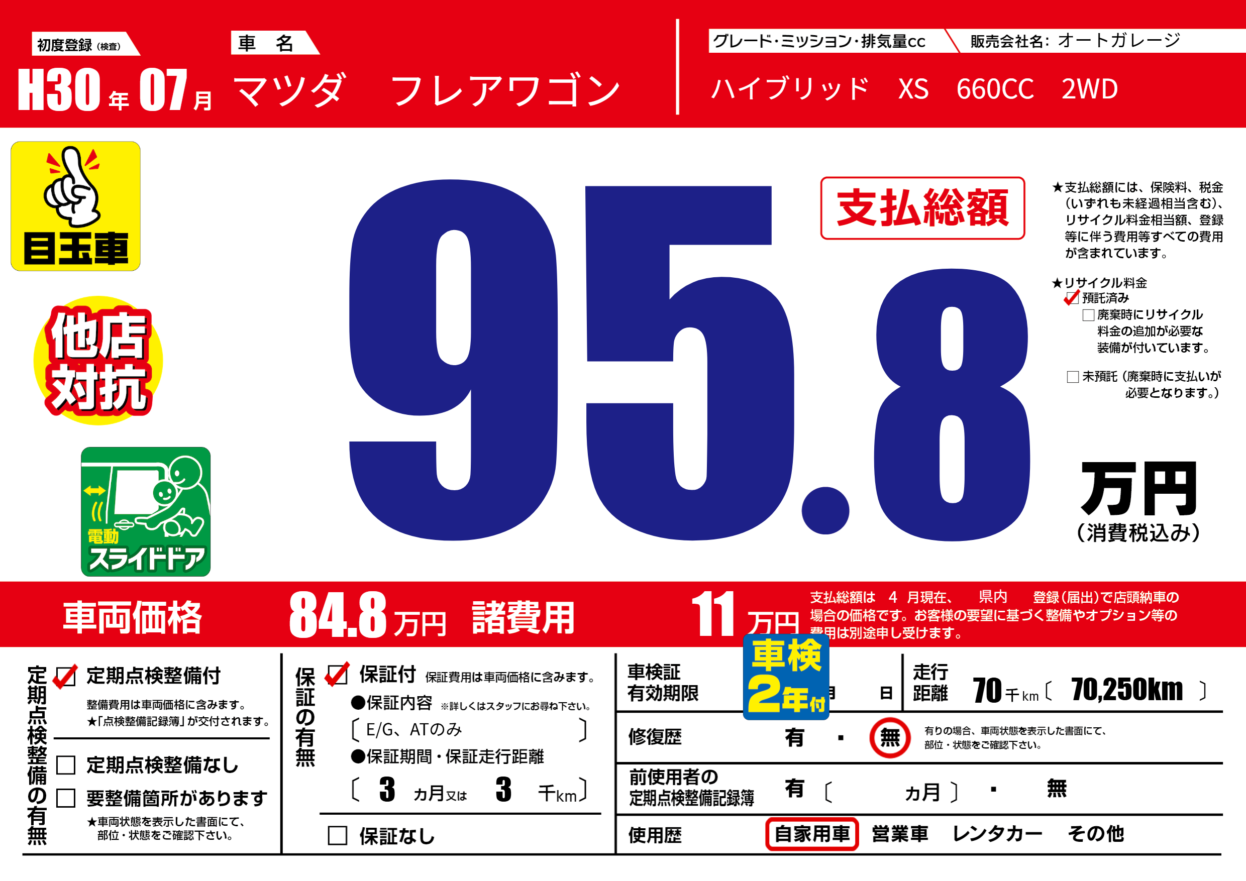 | 車名 | マツダ フレアワゴン | グレード ミッション 排気量 |