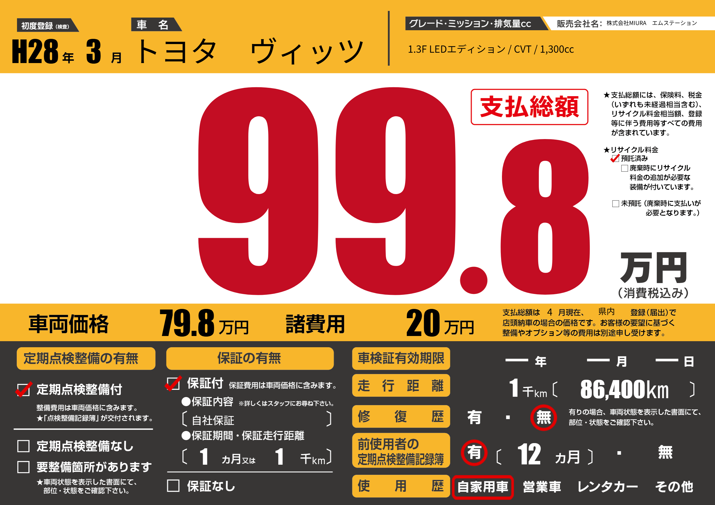 | 車名 | トヨタ ヴィッツ | グレード ミッション 排気量 |