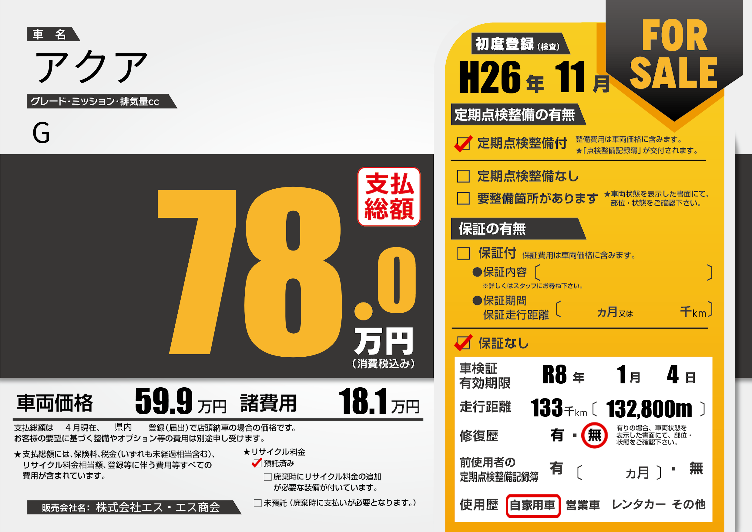 | 走行キロ | 13.3万km | 初年度登録 | H26年11月 |