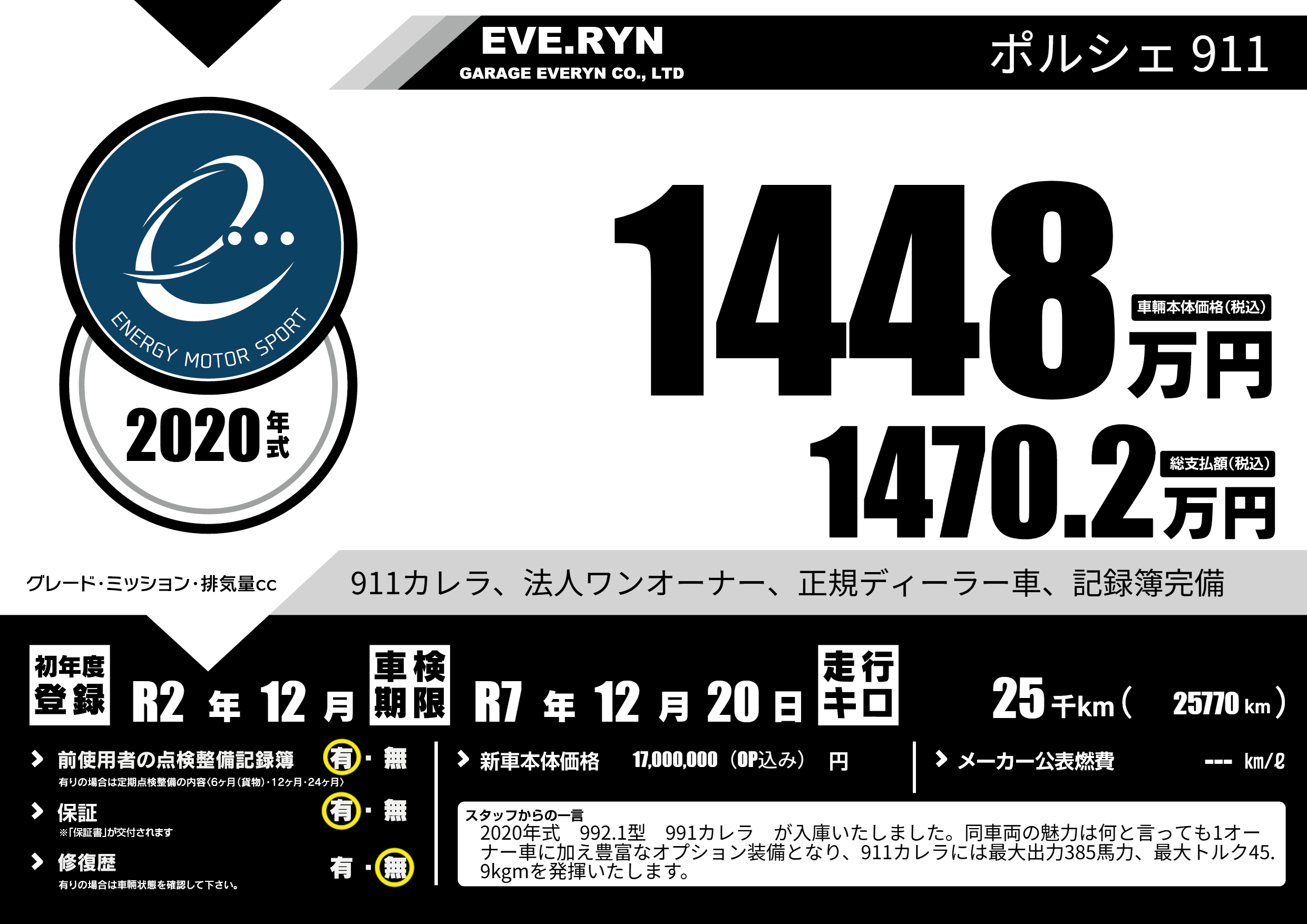 | 車名 | ポルシェ 911 | グレード ミッション 排気量 |