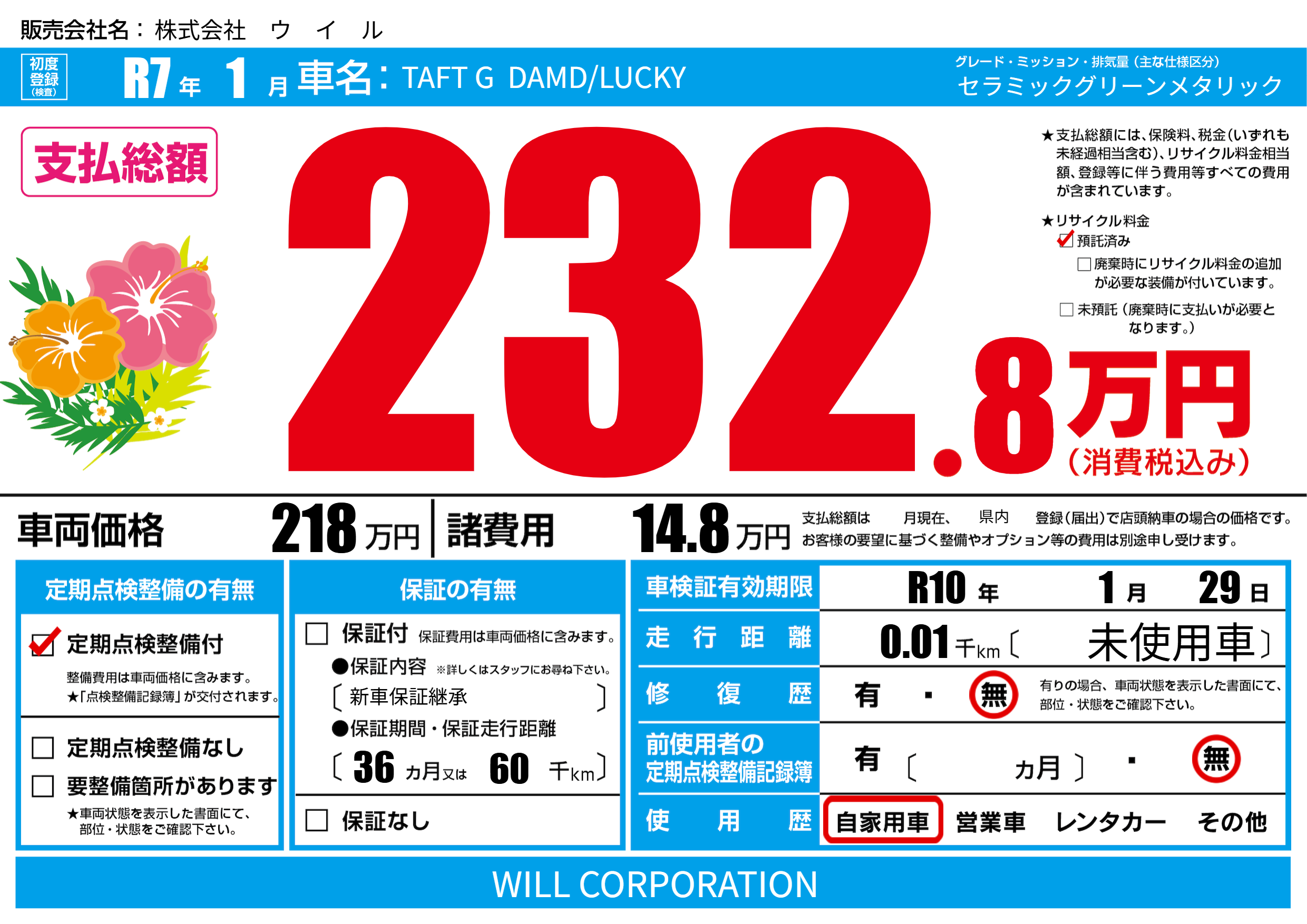 | 車検制限 | R10年 1月 29日 | ||
