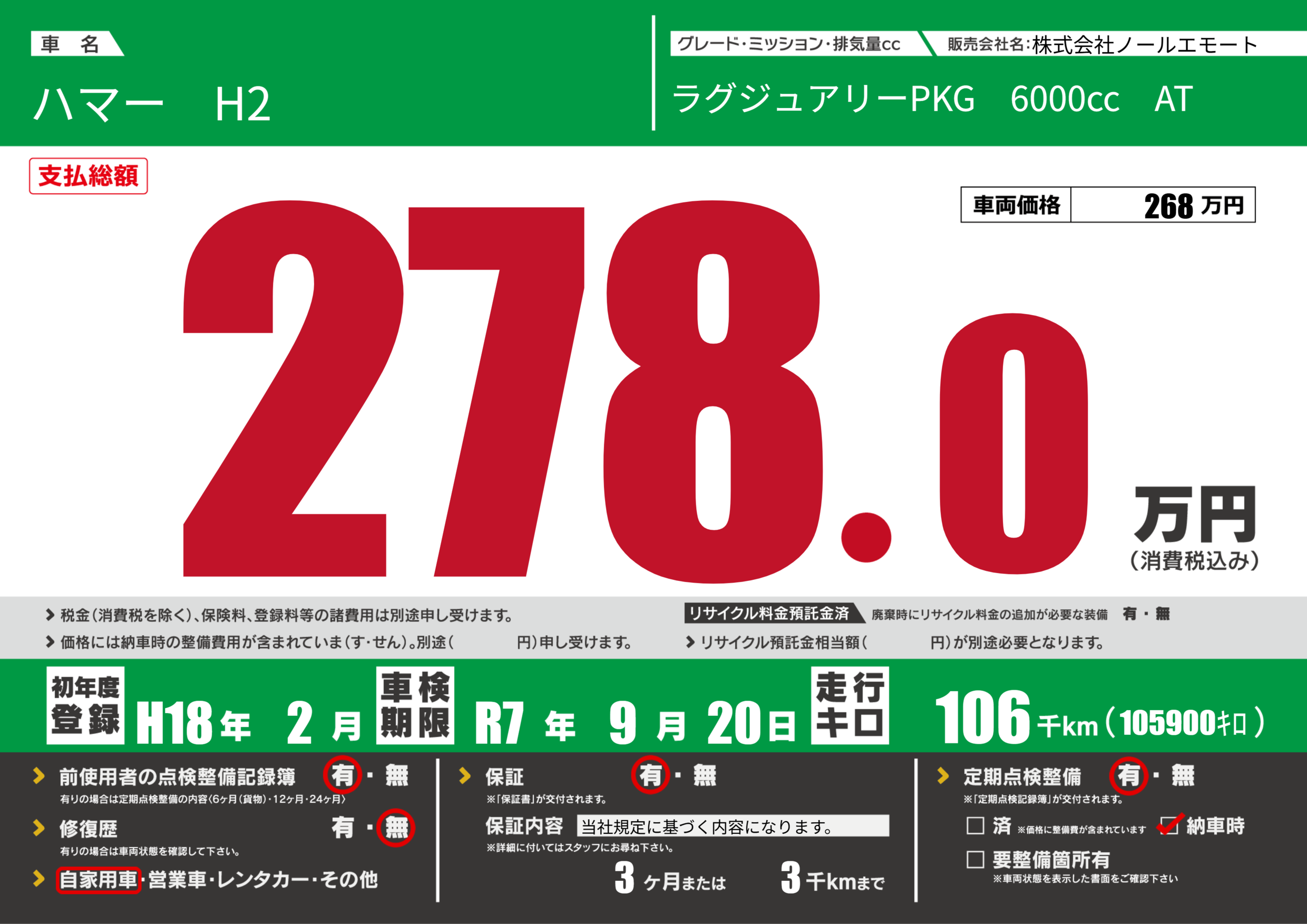 | 車名 | ハマー H2 | グレード ミッション 排気量 |