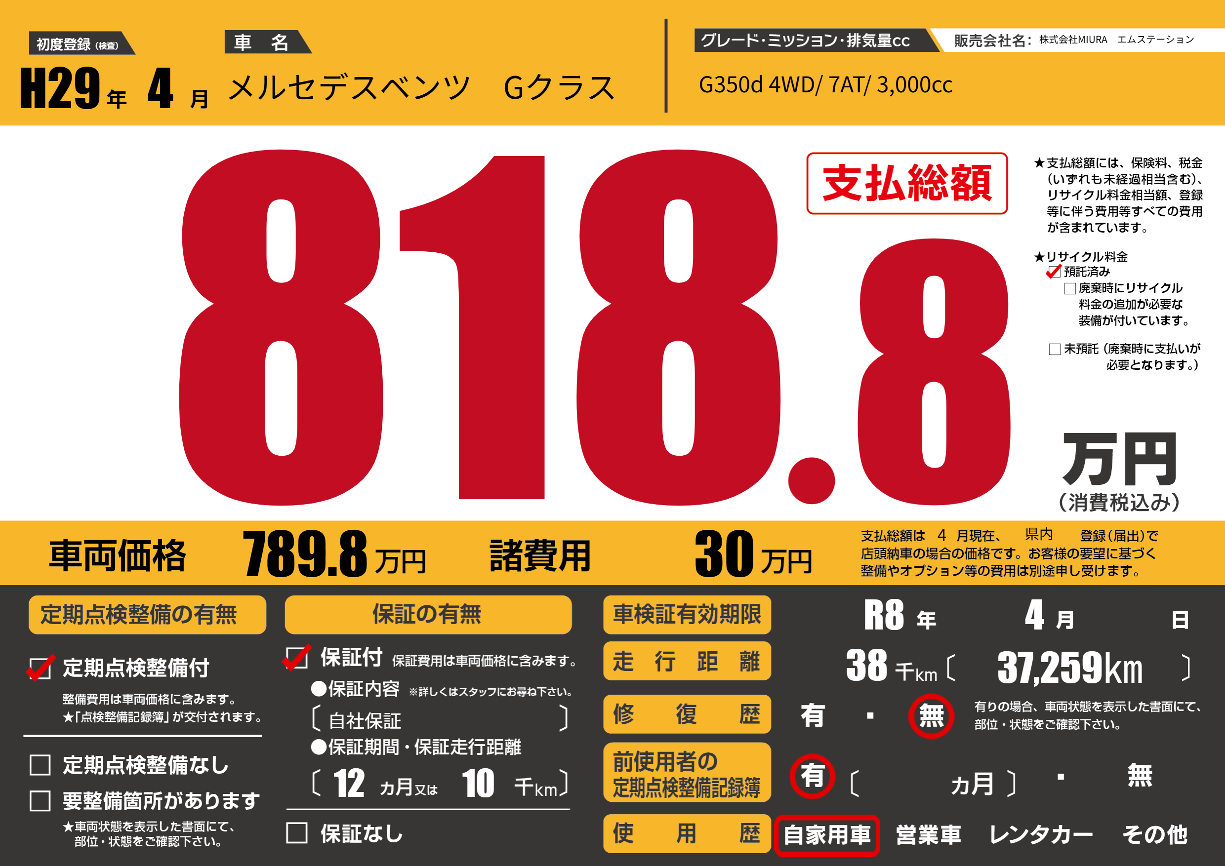 | 車名 | メルセデスベンツ Gクラス | グレード ミッション 排気量 |