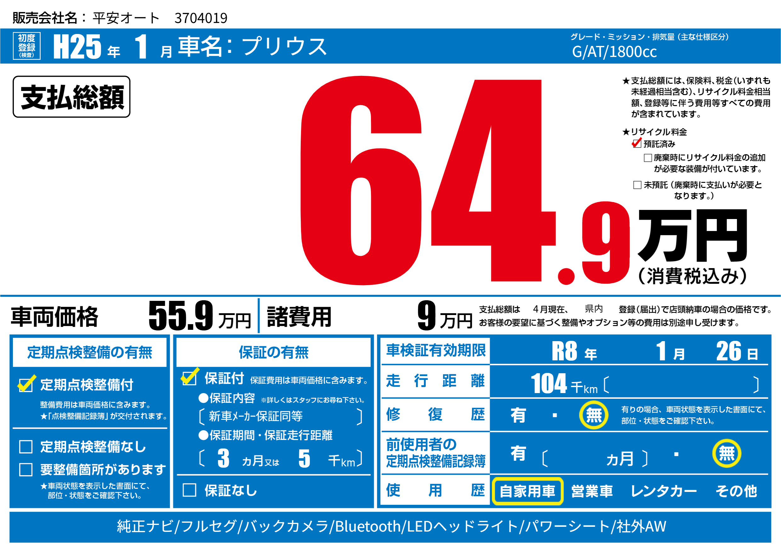 | 車名 | プリウス | グレード ミッション 排気量 |