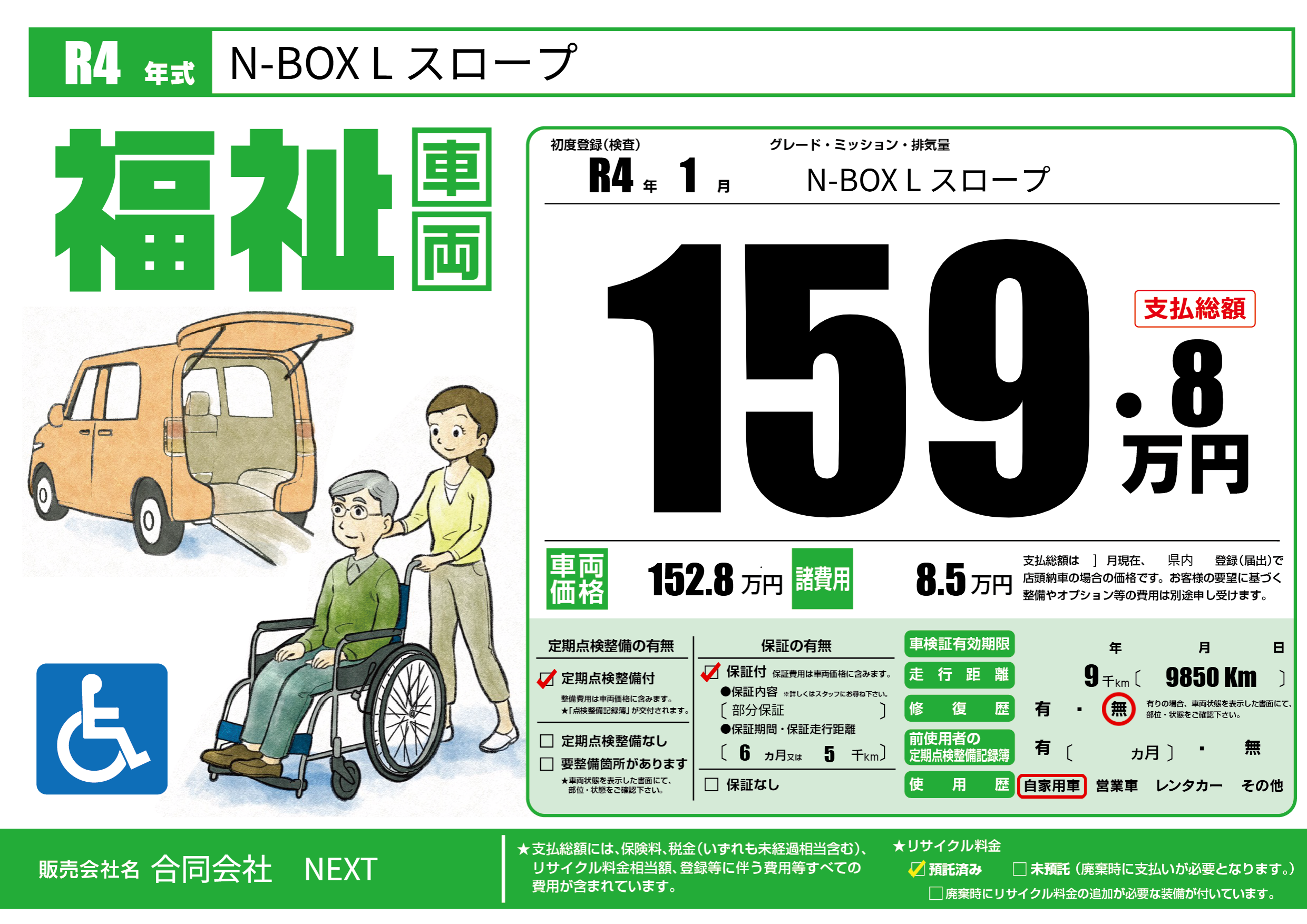 | 車名 | N-BOX L スロープ | グレード ミッション 排気量 |
