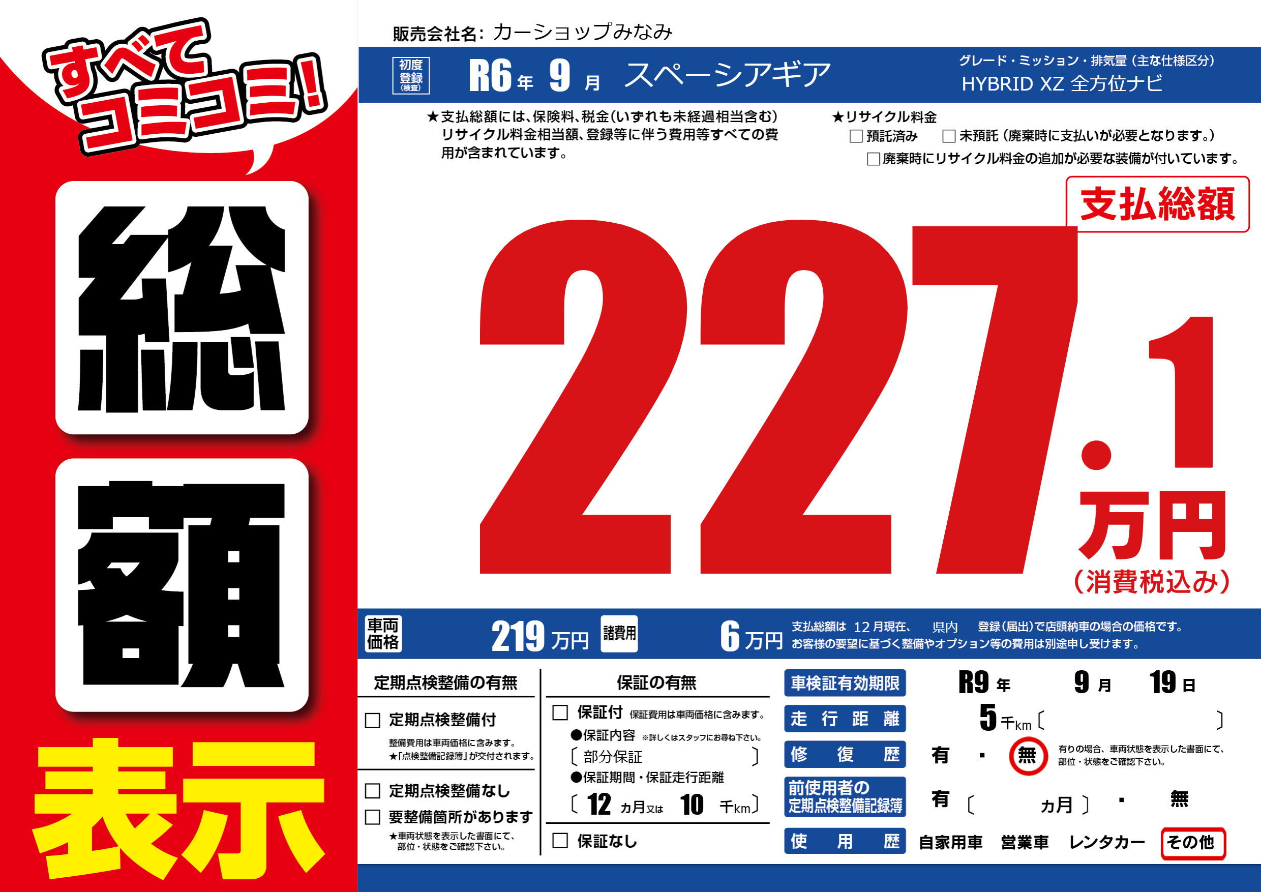 なし | 車検制限 | R9年9月19月 |