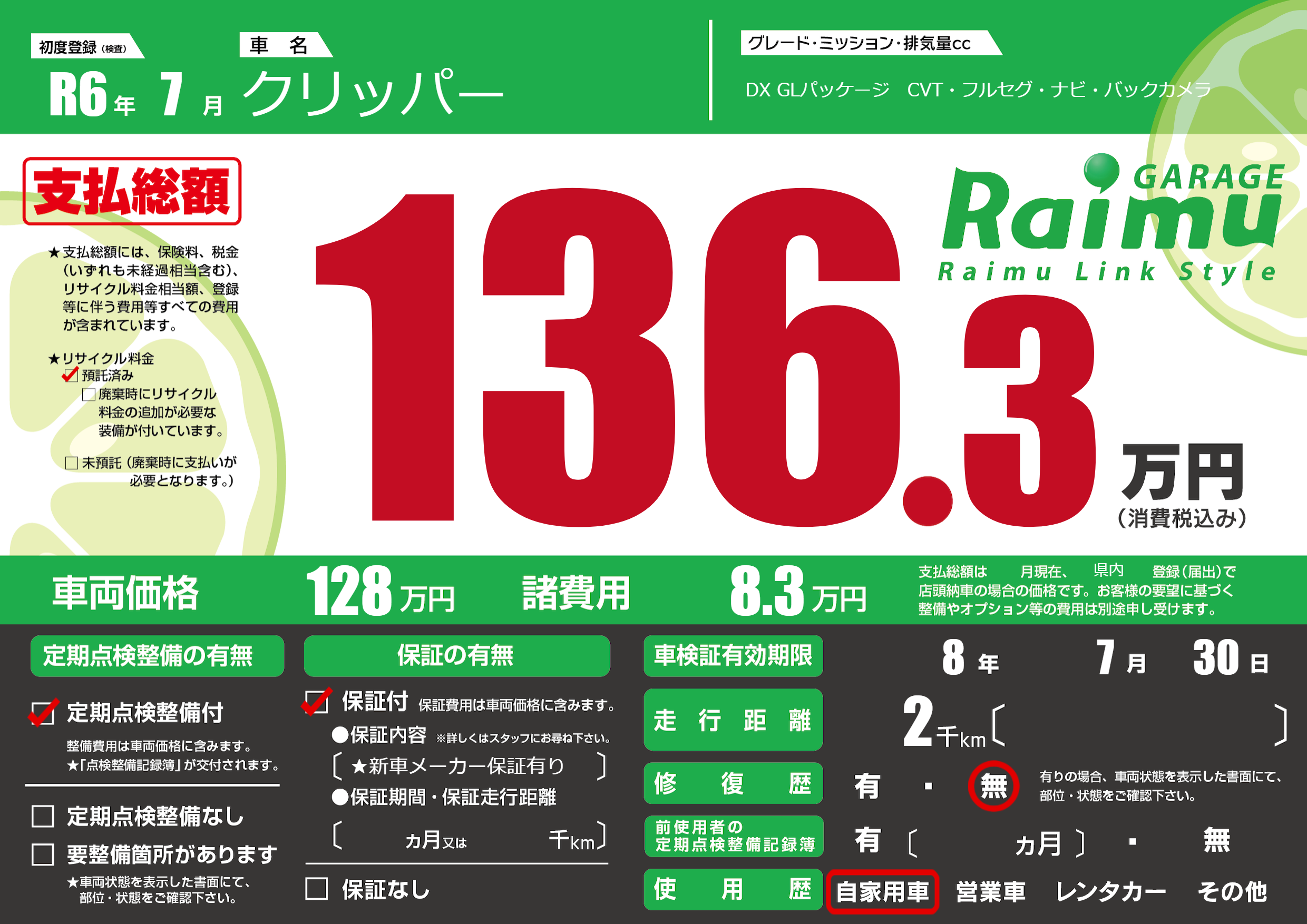 | 車検制限 | 8年 7月 30日 | ||