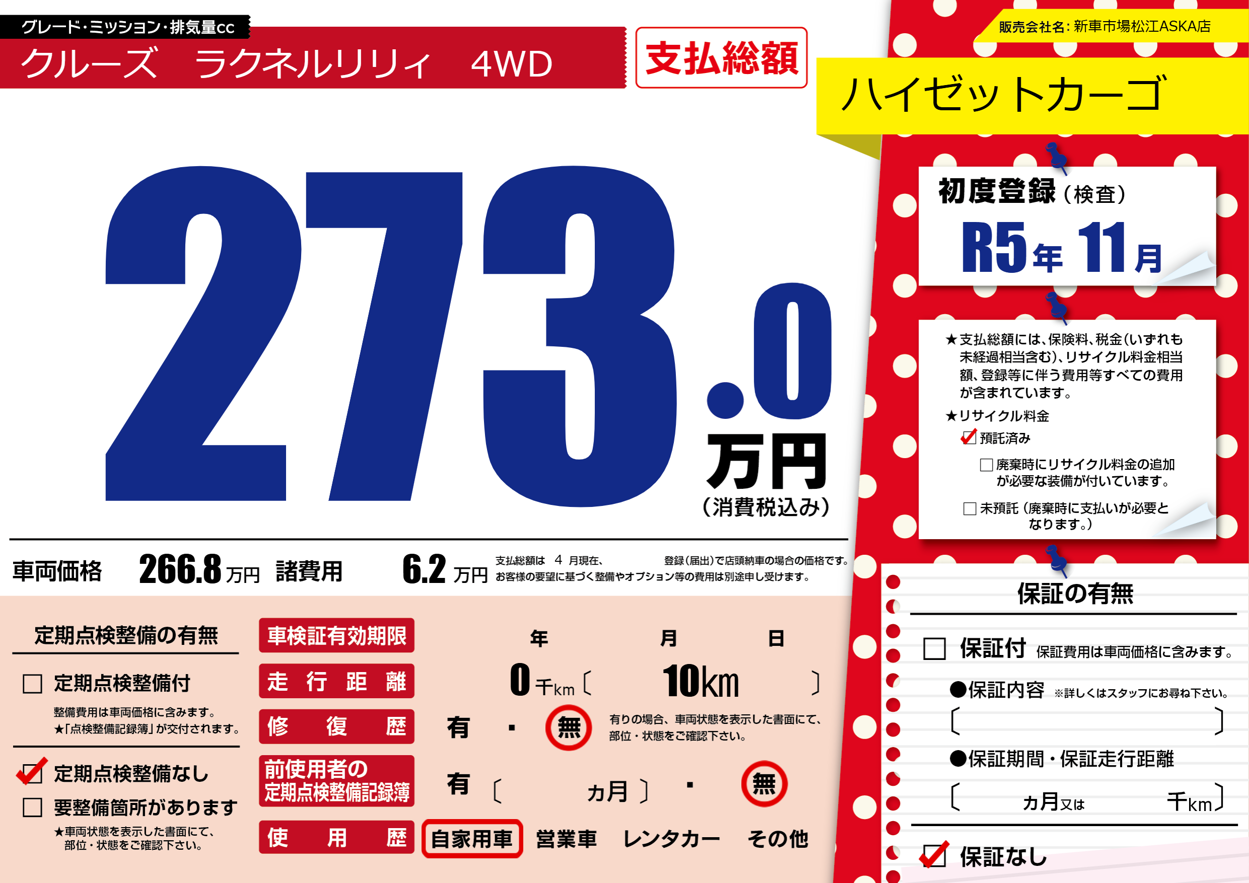 | 車名 | ハイゼットカーゴ | グレード ミッション 排気量 |