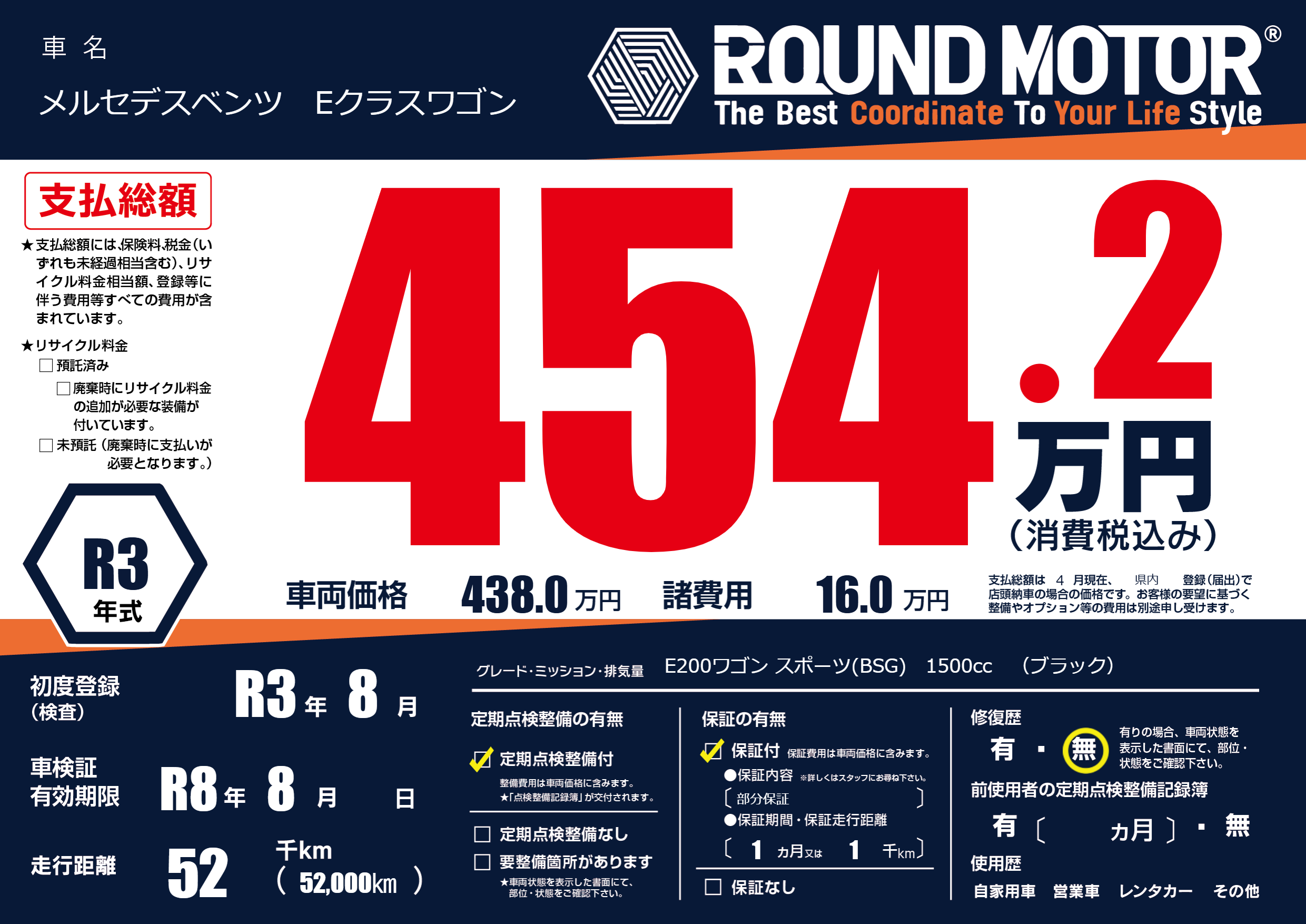 | 車名 | メルセデスベンツ Eクラスワゴン | グレード ミッション 排気量 |