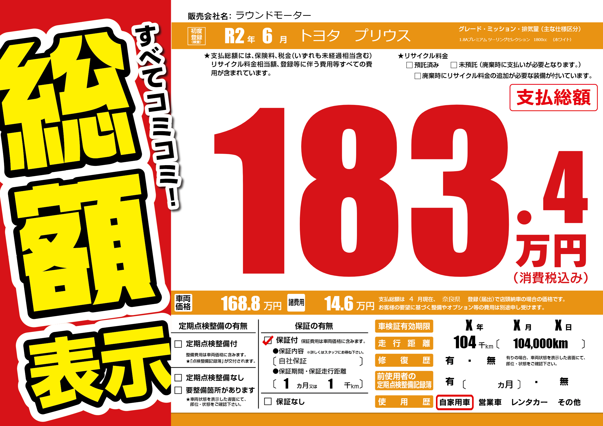 | 車名 | トヨタ プリウス | グレード ミッション 排気量 |