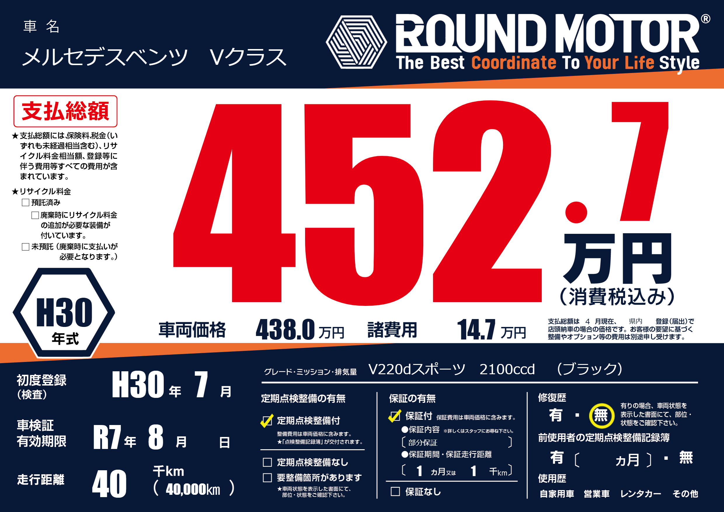 | 車名 | メルセデスベンツ Vクラス | グレード ミッション 排気量 |