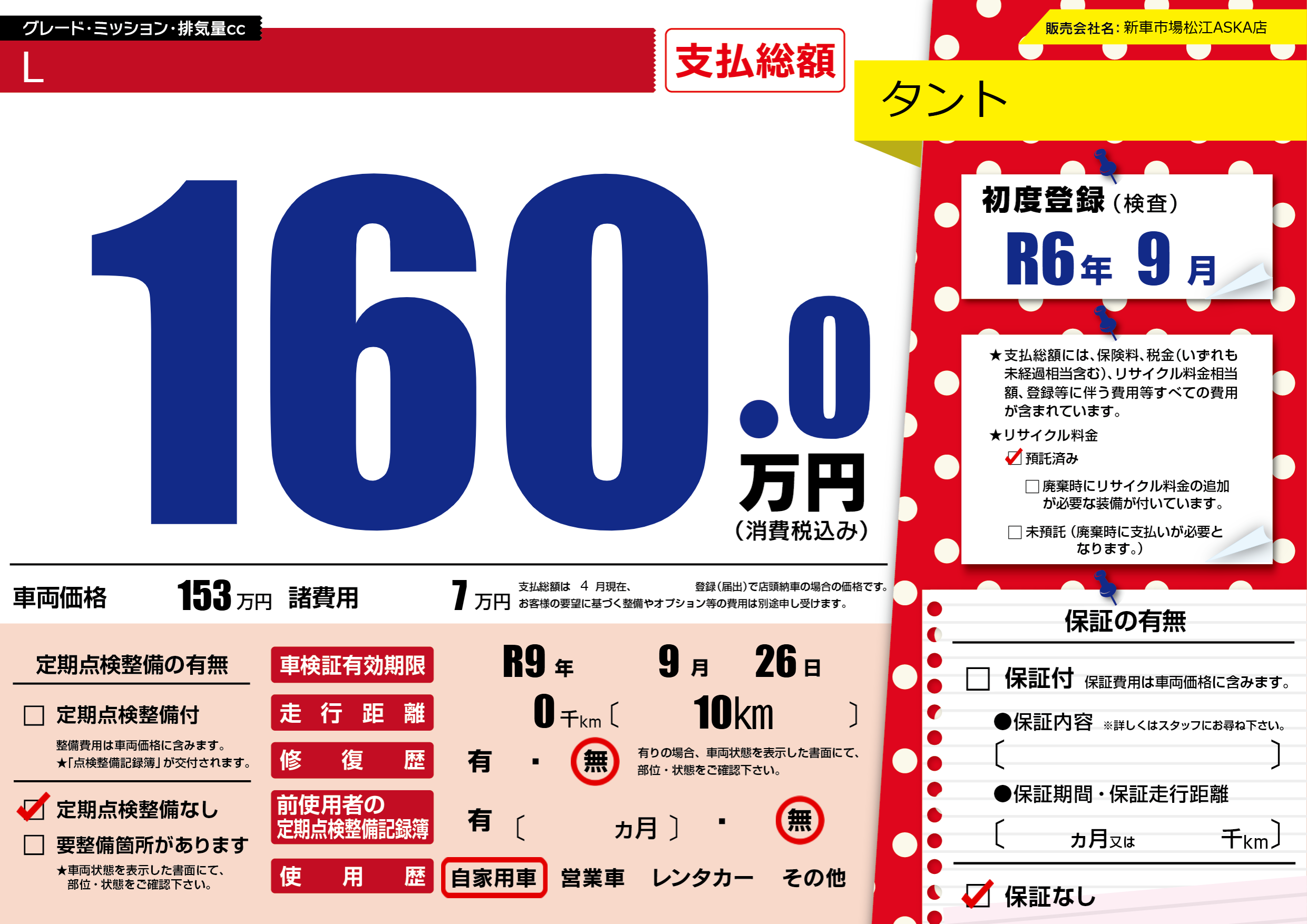 なし | 車検制限 | R9年9月26月 |