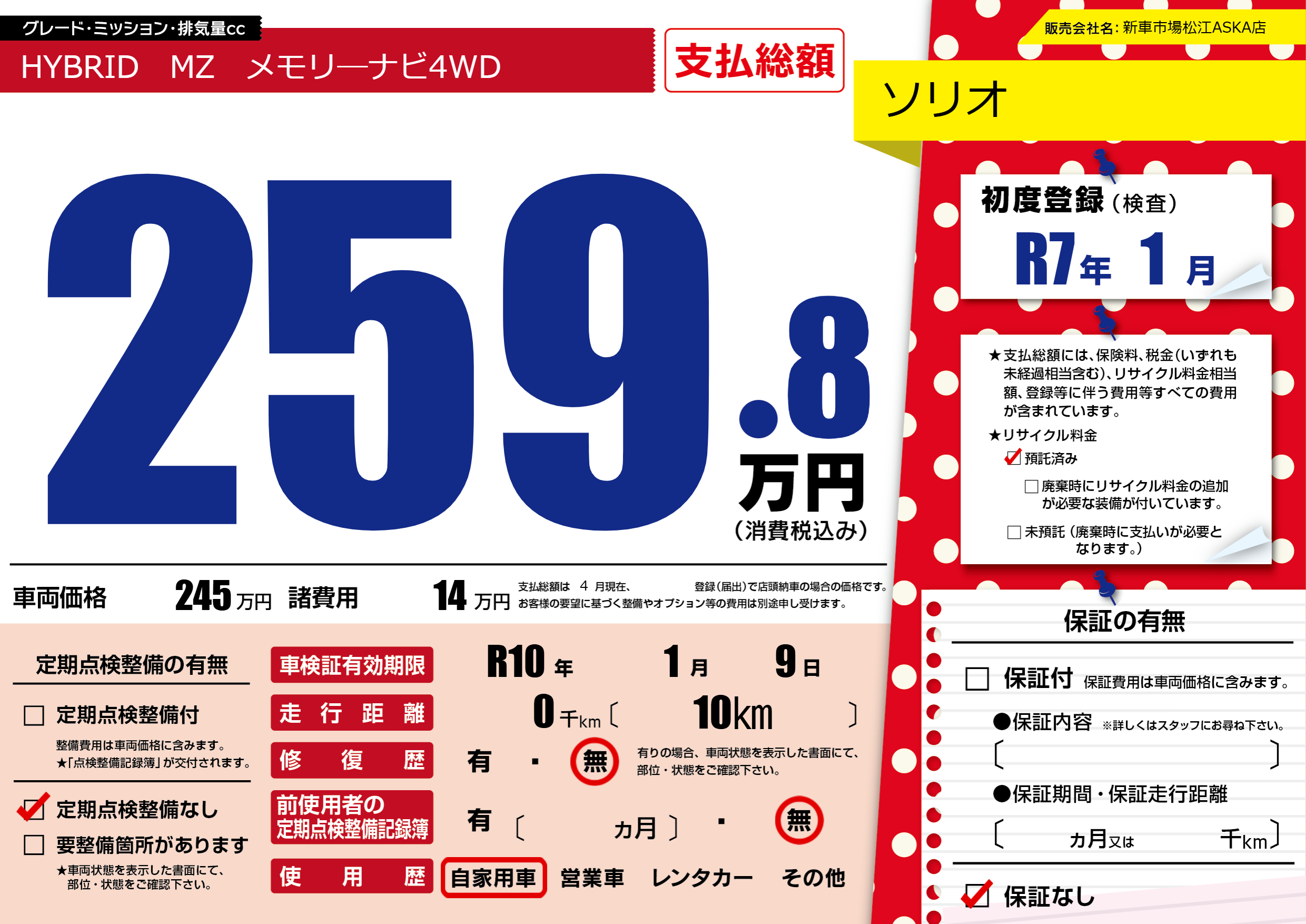 なし | 車検制限 | R10年1月9月 |