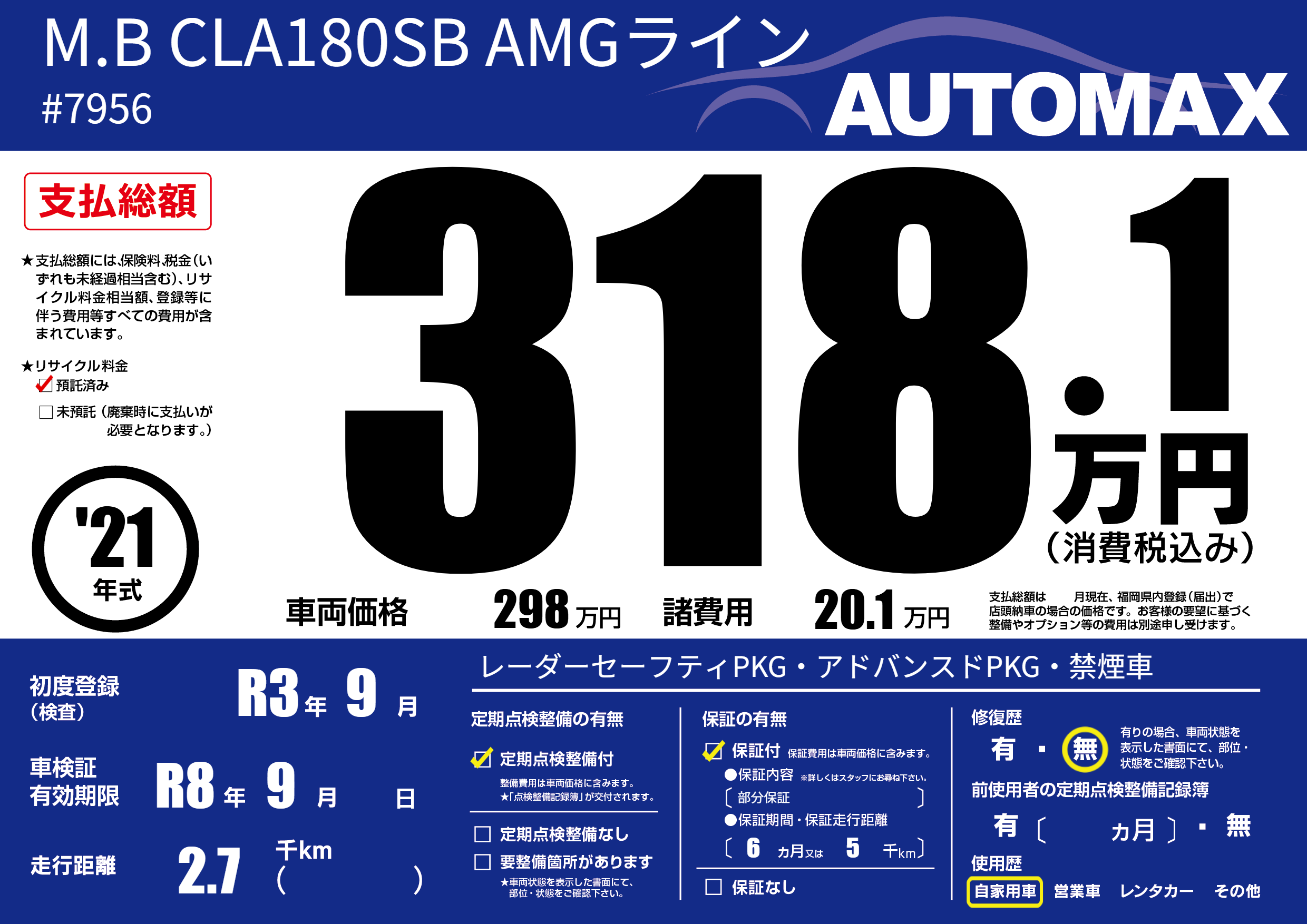 | 車名 | M.B CLA180SB AMGライン | グレード ミッション 排気量 |