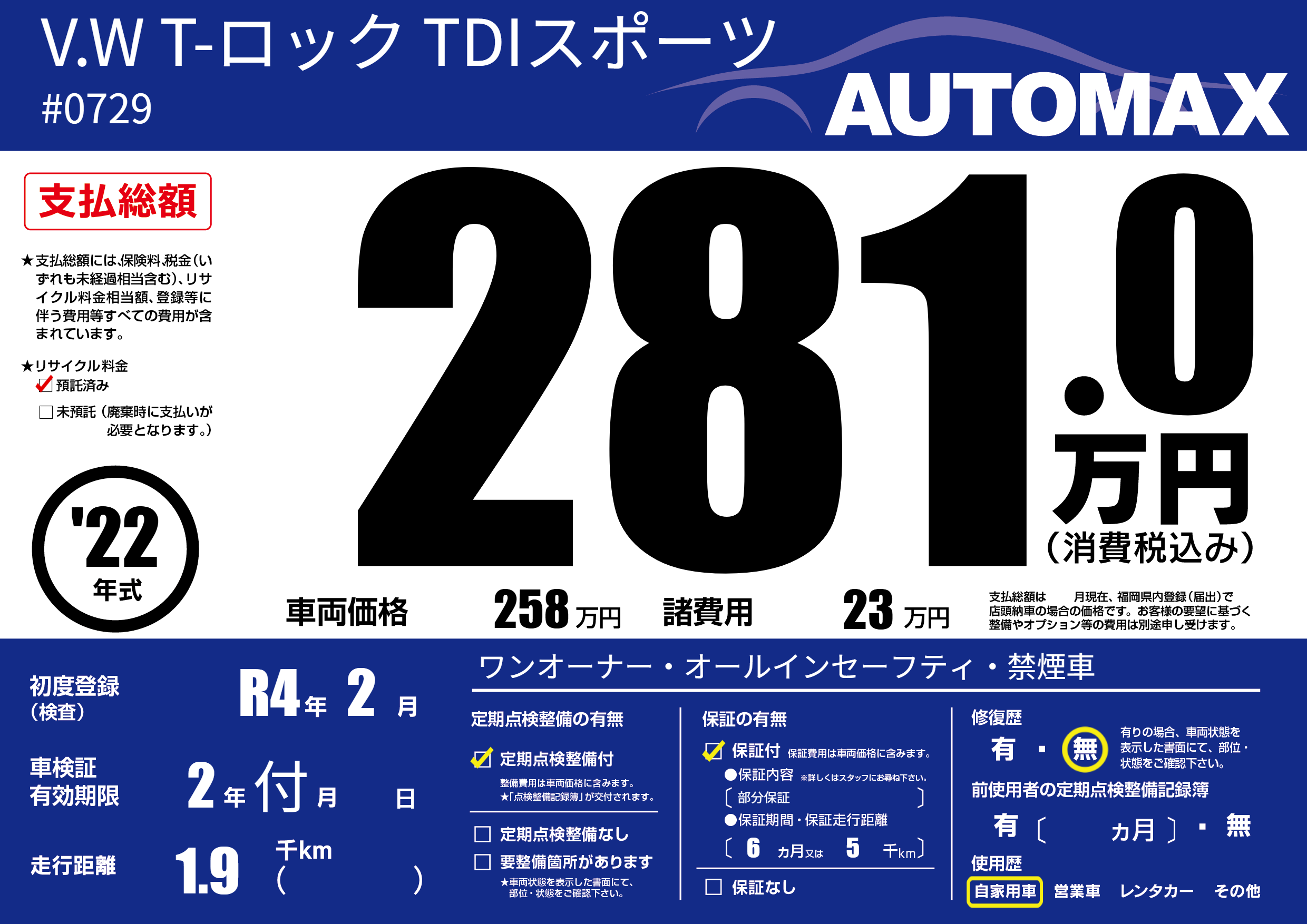 | 車名 | V.W T-ロック TDIスポーツ | グレード ミッション 排気量 |