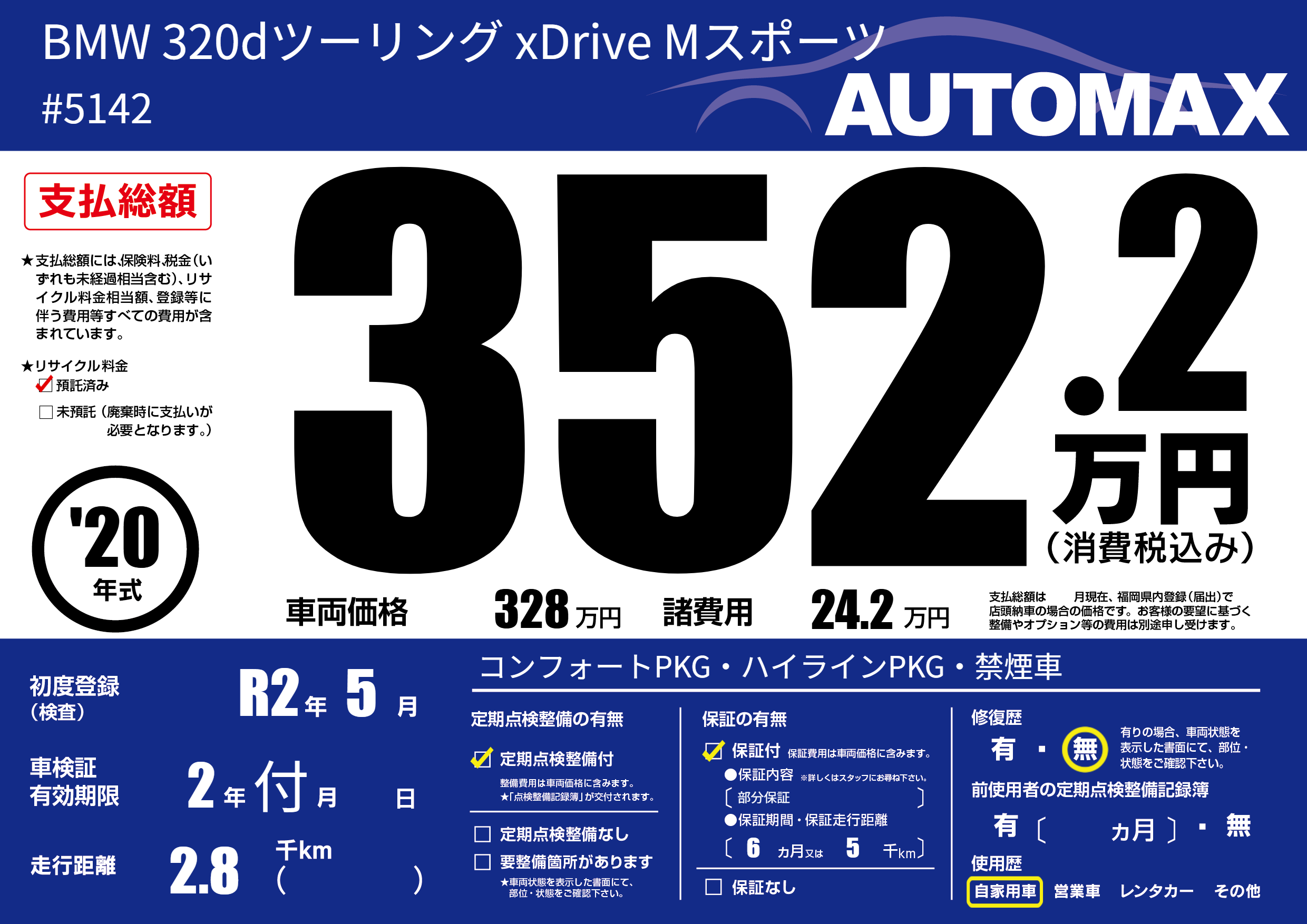 | 車名 | BMW 320dツーリング xDrive Mスポーツ | グレード ミッション 排気量 |
