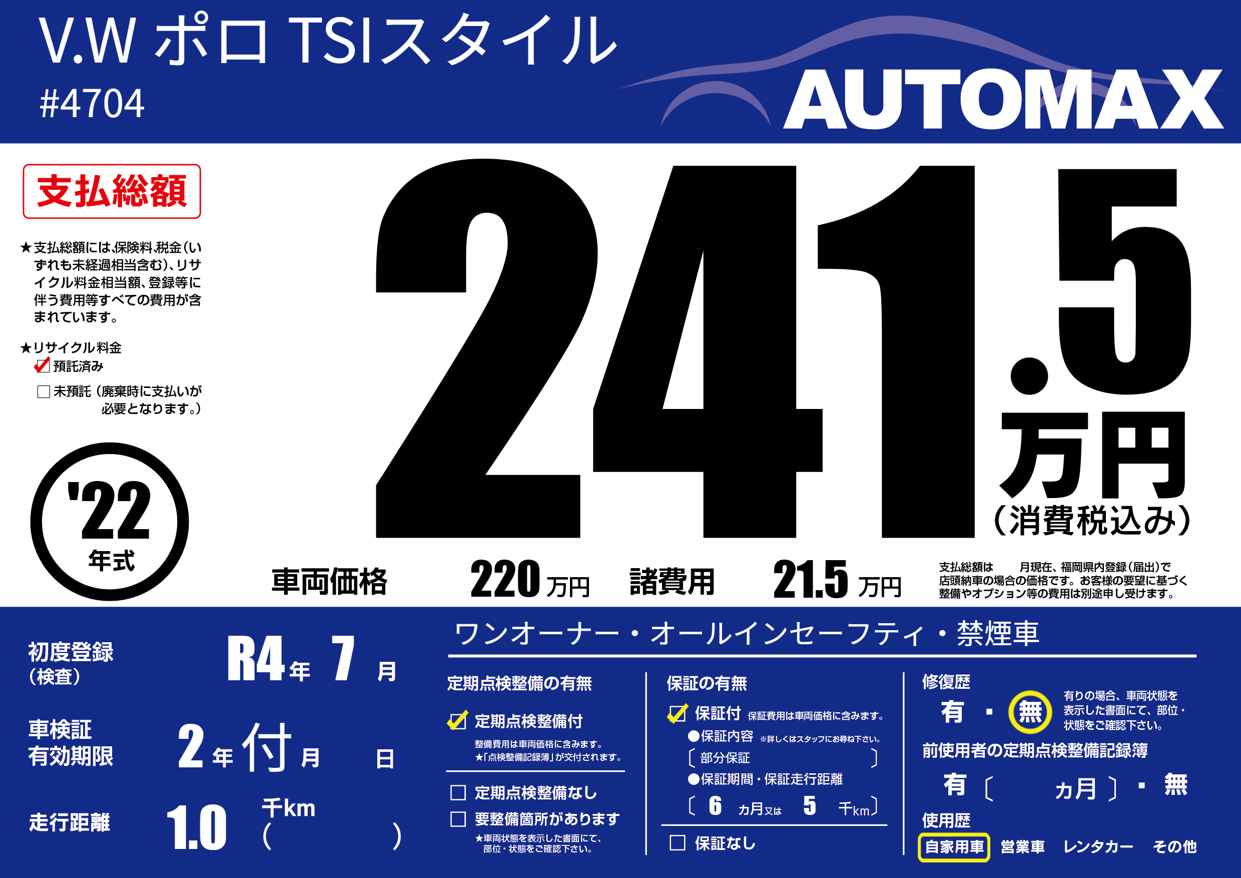 | 車名 | V.W ポロ TSIスタイル | グレード ミッション 排気量 |