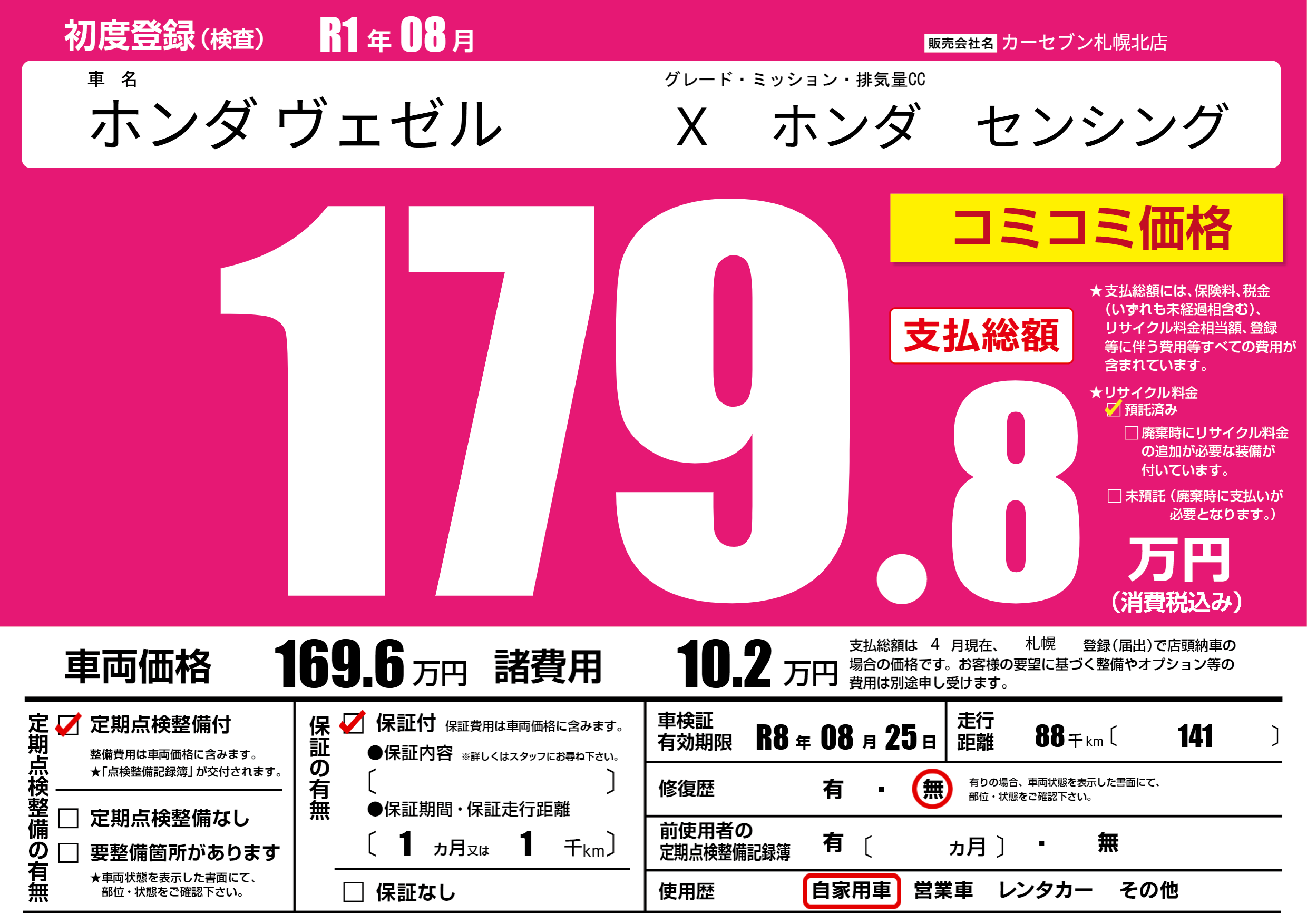 | 車名 | ホンダ ヴェゼル | グレード ミッション 排気量 |