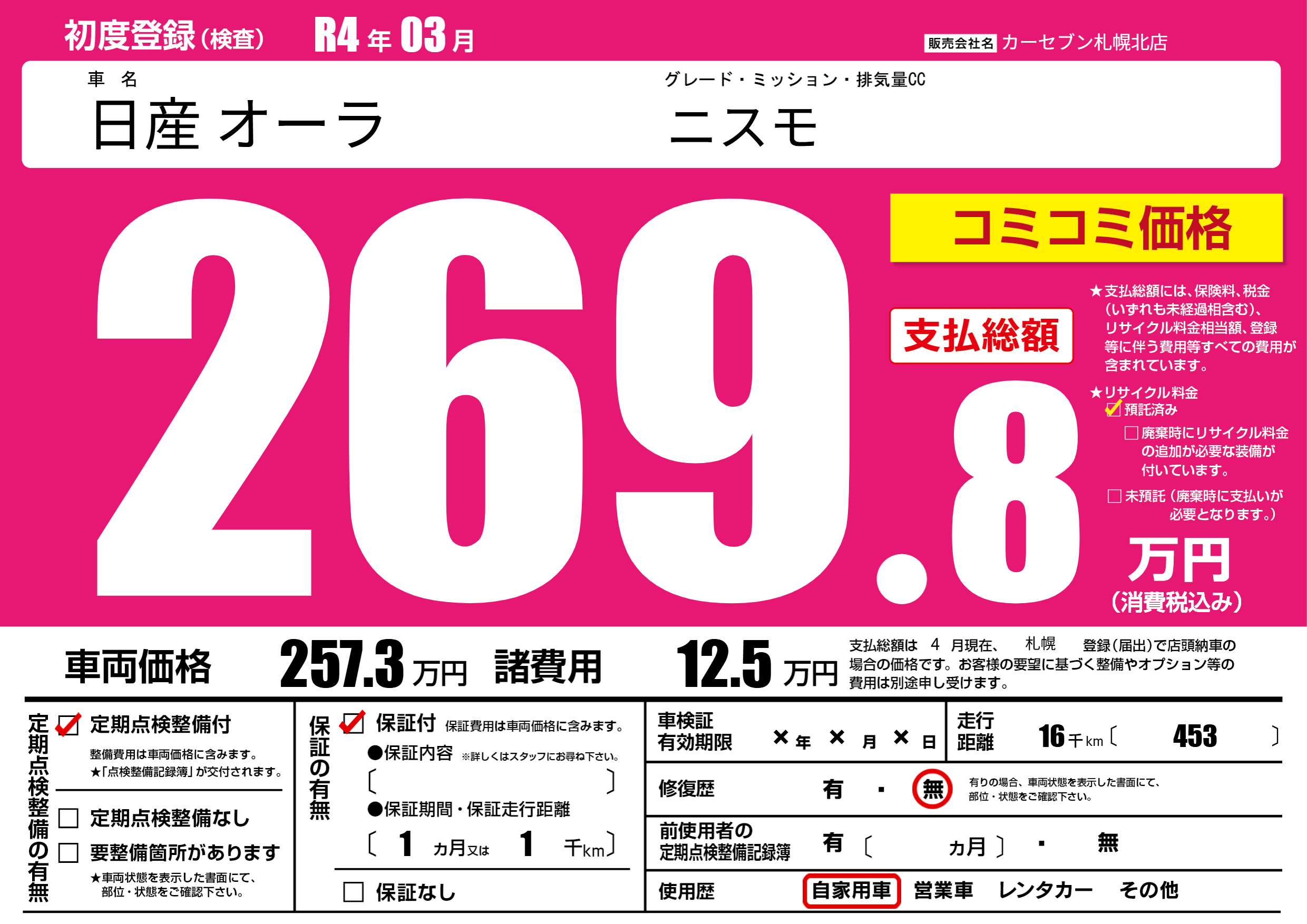 | 車名 | 日産 オーラ | グレード ミッション 排気量 |